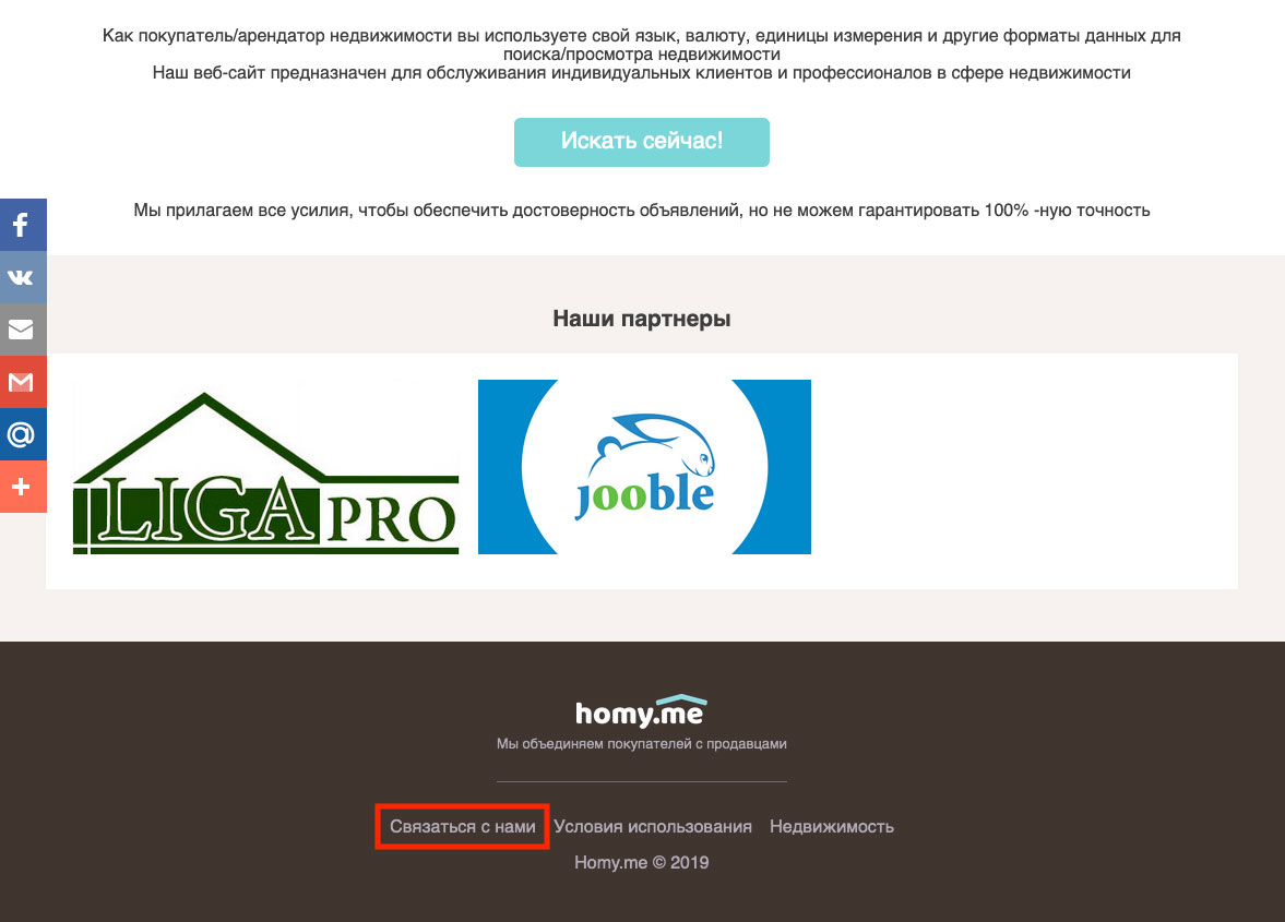 - Перейти на сайт homyme.com и внизу найти ссылку «Связаться с нами» (Рис. 751).