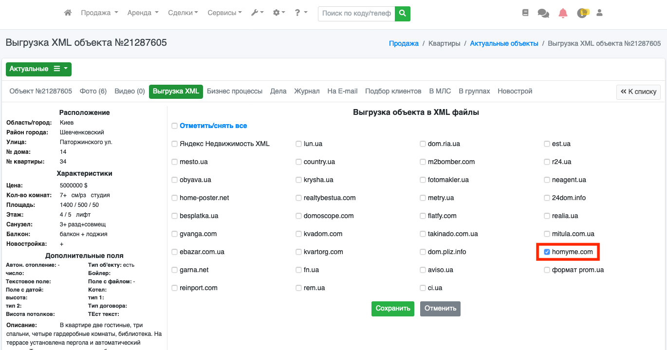 Если Вы отправили файл с выбранными объектами также необходимо в редактировании объекта на вкладке «Выгрузка XML» поставить галочку напротив портала homyme.com и нажать кнопку сохранить, после этого объект попадает в файл с выбранными объектами и публикуется на homyme.com (Рис. 758).