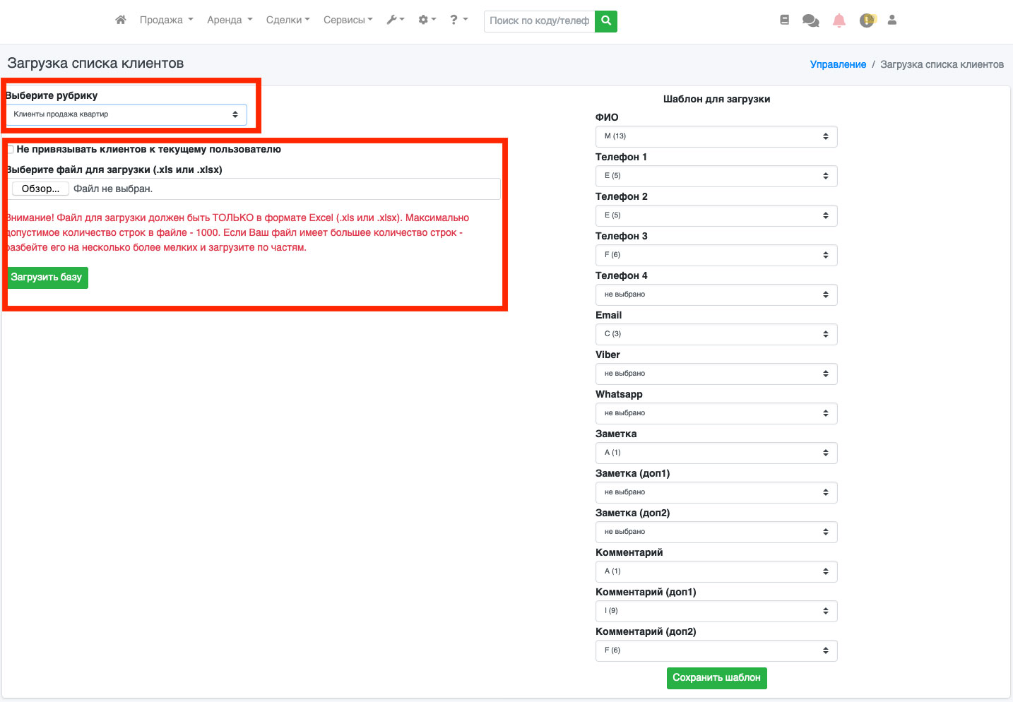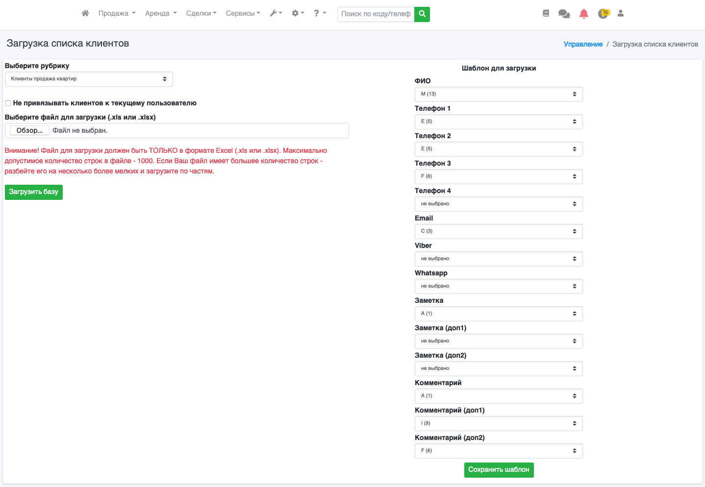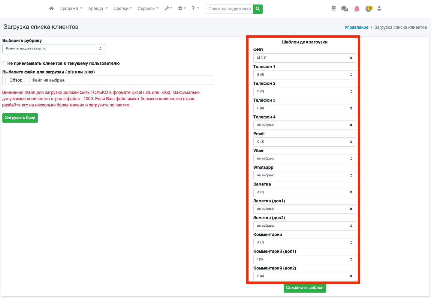 На первом этапе Ваш нужно подготовить шаблон для загрузки (Рис. 821). Все что Вам необходимо просто указать в шаблоне напротив нужного поля соответствующий столбец в файле клиентов с Excel. После того как Вы указали все необходимые поля необходимо нажать кнопку “Сохранить шаблон” (Рис. 822).