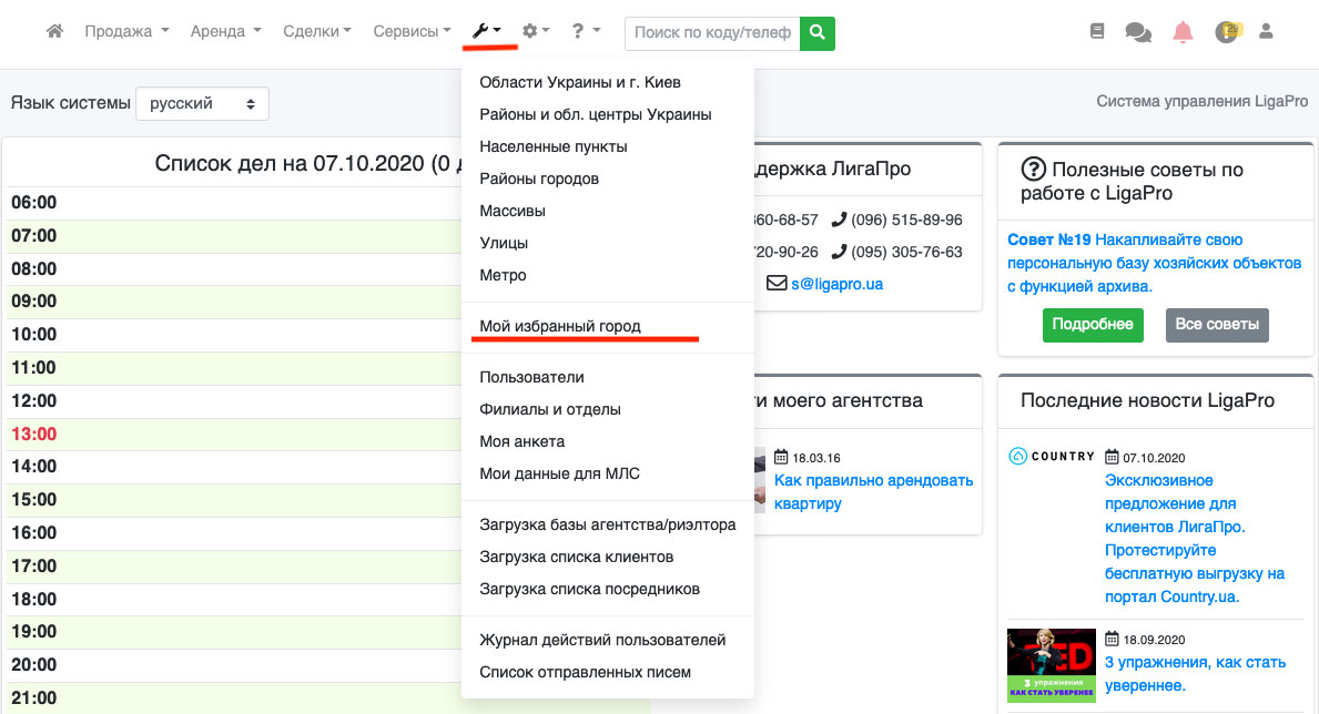 Для удобства работы с объектами в системе ЛигаПро предусмотрена возможность настраивать свой избранный город. Это позволяет при добавлении объекта в систему не указывать Ваш город, а система автоматически подставит Ваш город. Это позволяет экономить время при добавлении объектов.