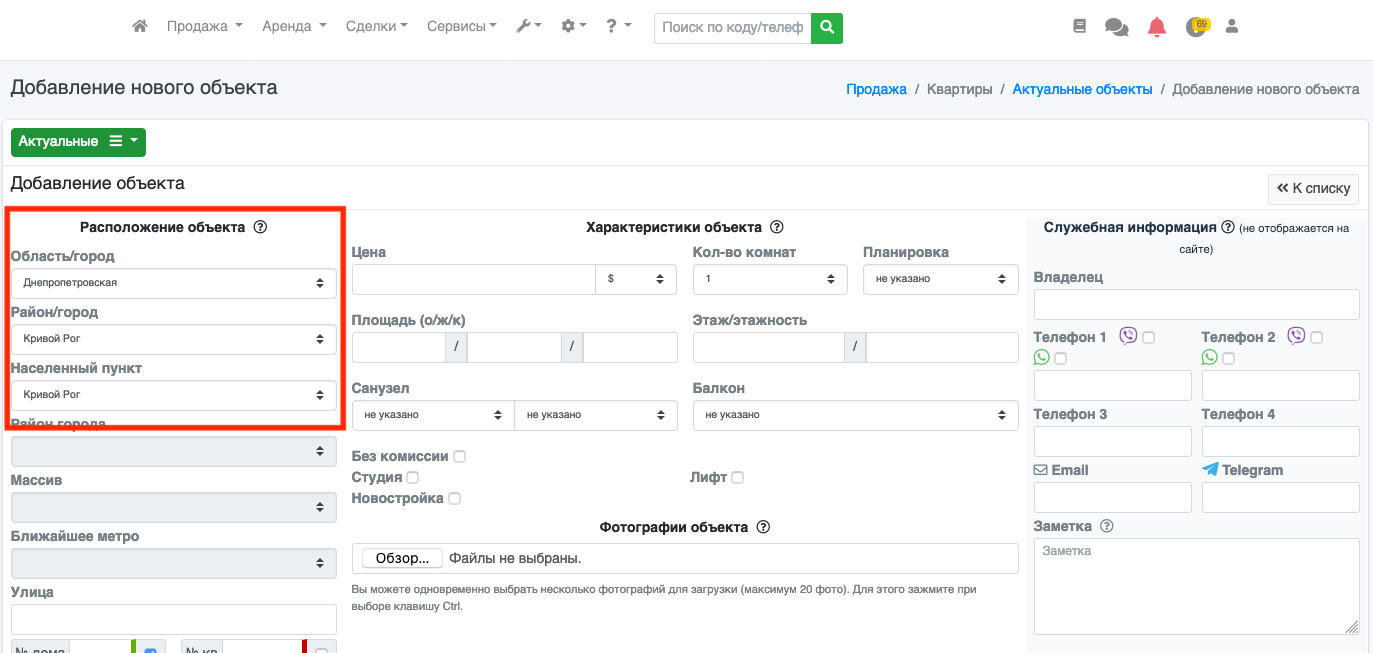 На открывшейся странице Вы увидете, что в блоке «Расположение» у Вас уже автоматически установлено расположение объекта (Рис. 872).