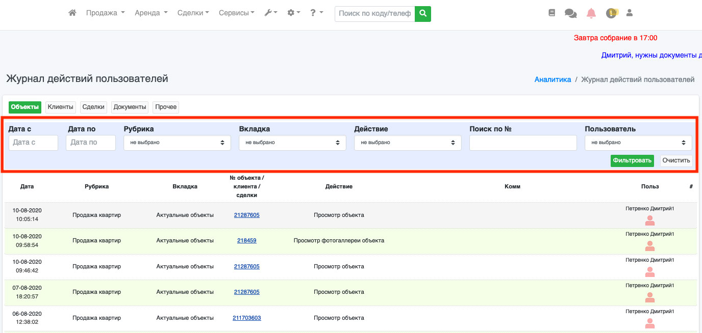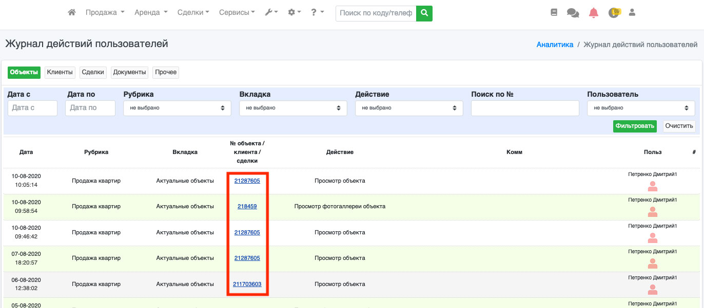 На открывшейся странице на вкладке «Объекты» в фильтре, чтобы быстро найди нужный объект Вы можете задать такие параметры как дата удаления, рубрика, вкладка, код объекта и пользователь. (Рис. 874).