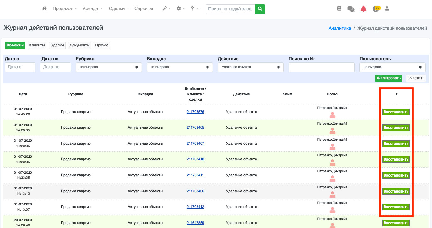Для того чтобы восстановить объект просто нажмите на кнопку «Восстановить» (Рис. 877). После этого объект будет восстановлен.