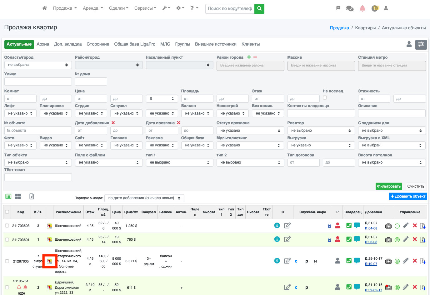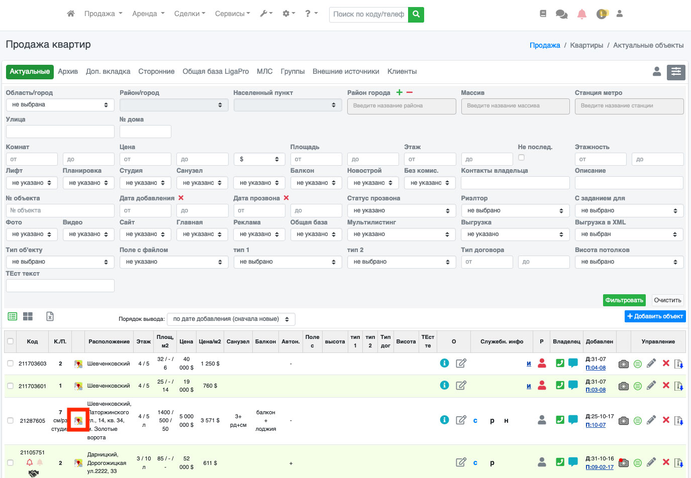 При добавлении объекта, основываясь на его местоположении система автоматически устанавливают метку на карте. В последующем это расположение указывается на Вашем внешнем сайте на странице объекта, внутри системы при отображении объекта на карте. Иногда в связи с неверным названием улицы, не указанием номера дома или другими параметрам система не верно определяет положение объекта на карте. Именно по этому существует возможность ручного указания местоположения объекта на карте. Для этого перейдите в нужную рубрику к списку объектов и найдите иконку «карты» и нажмите на нее (Рис. 882).