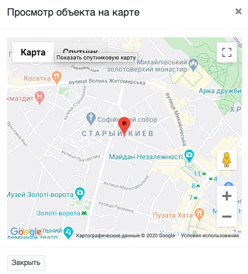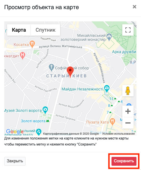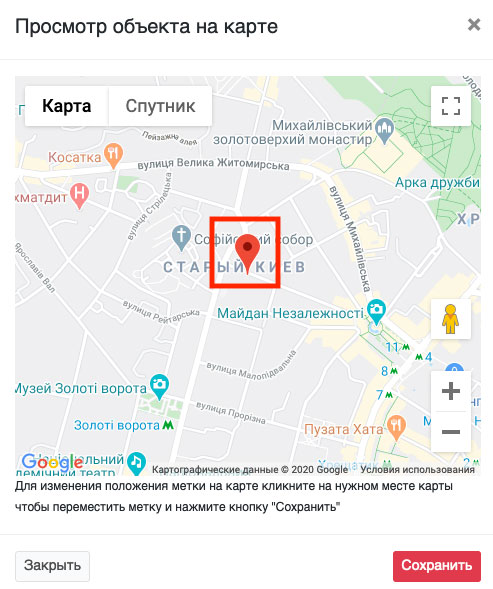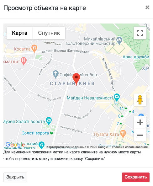 Нажав на иконку карты система отобразит диалоговое окно с отображением объекта на карте. Чтобы изменить местоположения объекта просто перетащиме на карте метку с местоположение в нужное место (Рис. 883).