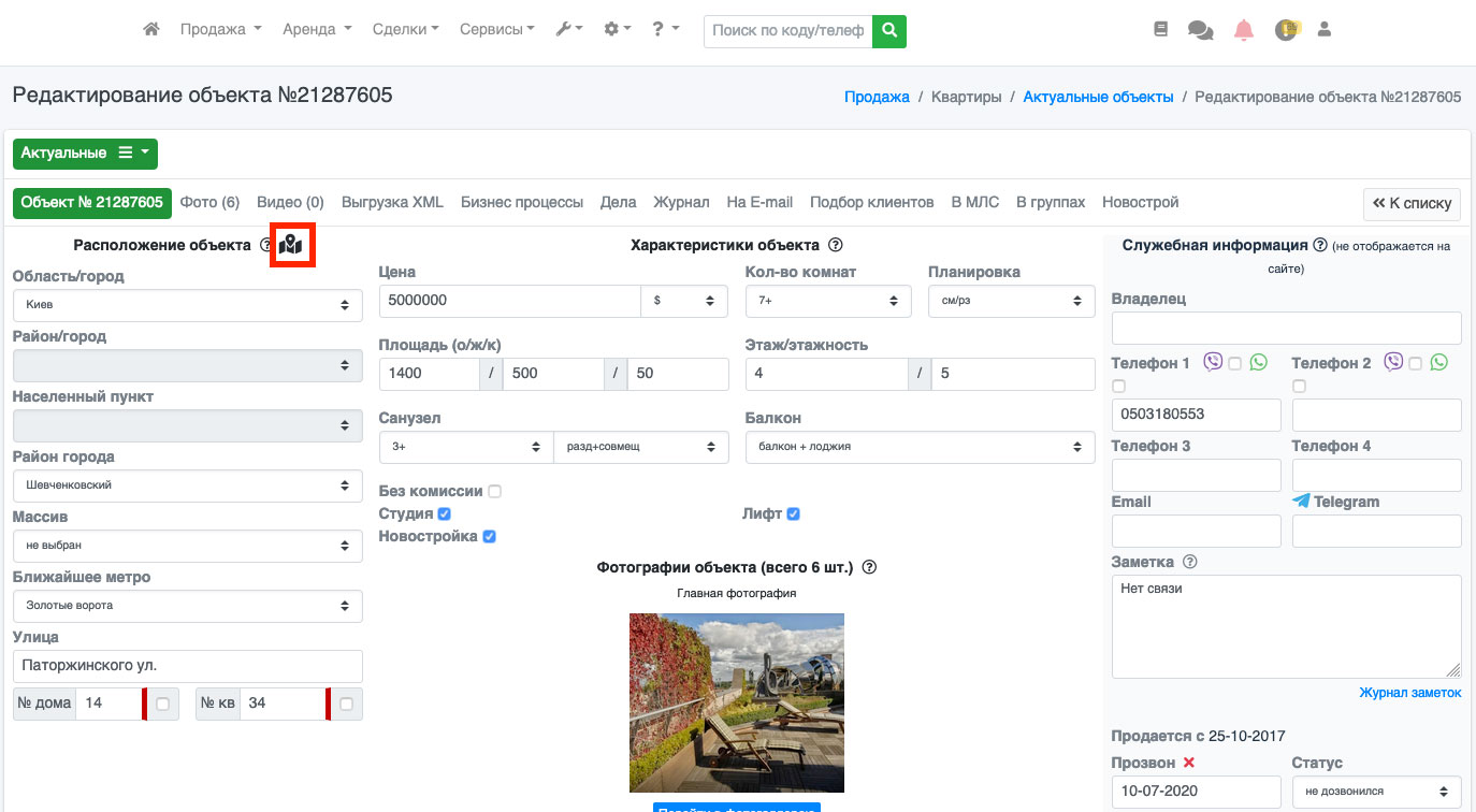 Чтобы посмотреть объект на карте со страницы редактирования, найдите возле блока расположения объекта иконку карты и нажмите на нее (Рис. 880).