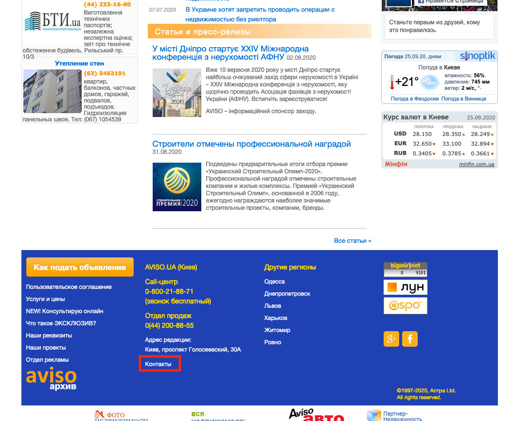 - Перейти на сайт aviso.ua и снизу найдите пункт «Контакты» (Рис. 905).