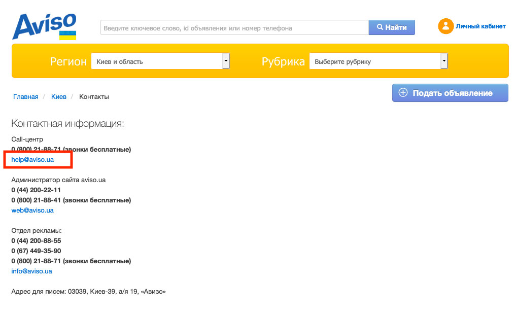 - На открывшейся странице найдите почту help@aviso.ua и напишите письмо в тех. Поддержку. Текст письма: «Прошу привязать мой XML файл к Вашему сайту. Ссылка на файл http://corp.ligapro.ua/files/yandex_xml/ya_xml_c4ca4_02e74.xml». (Рис. 906).