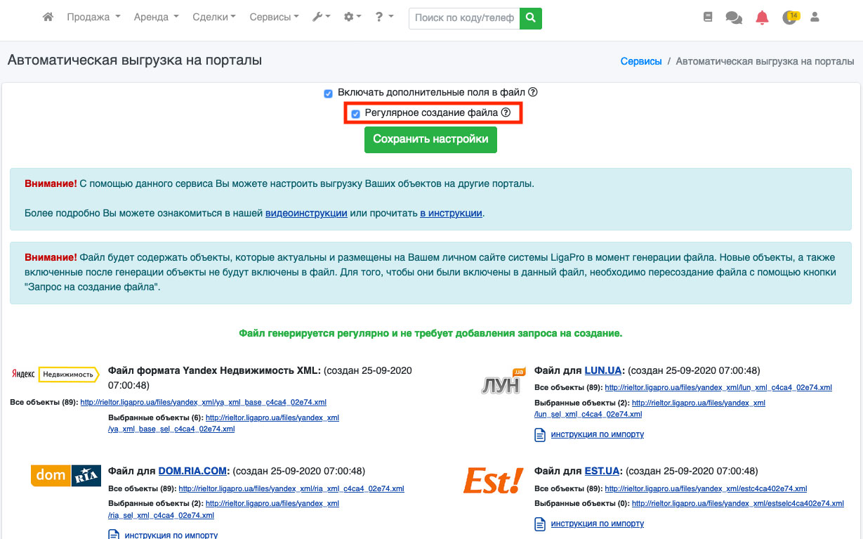 Чтобы найти ссылку на Ваш XML файл, в системе перейдите в пункт «Сервисы - Автоматическая выгрузка на порталы» (Рис. 907). Если на открывшейся странице еще нет списка файлов, поставьте галочку «Регулярное создание файла» и нажмите кнопку «Сохранить настройки». В течении дня файлы будут сгенерированы.