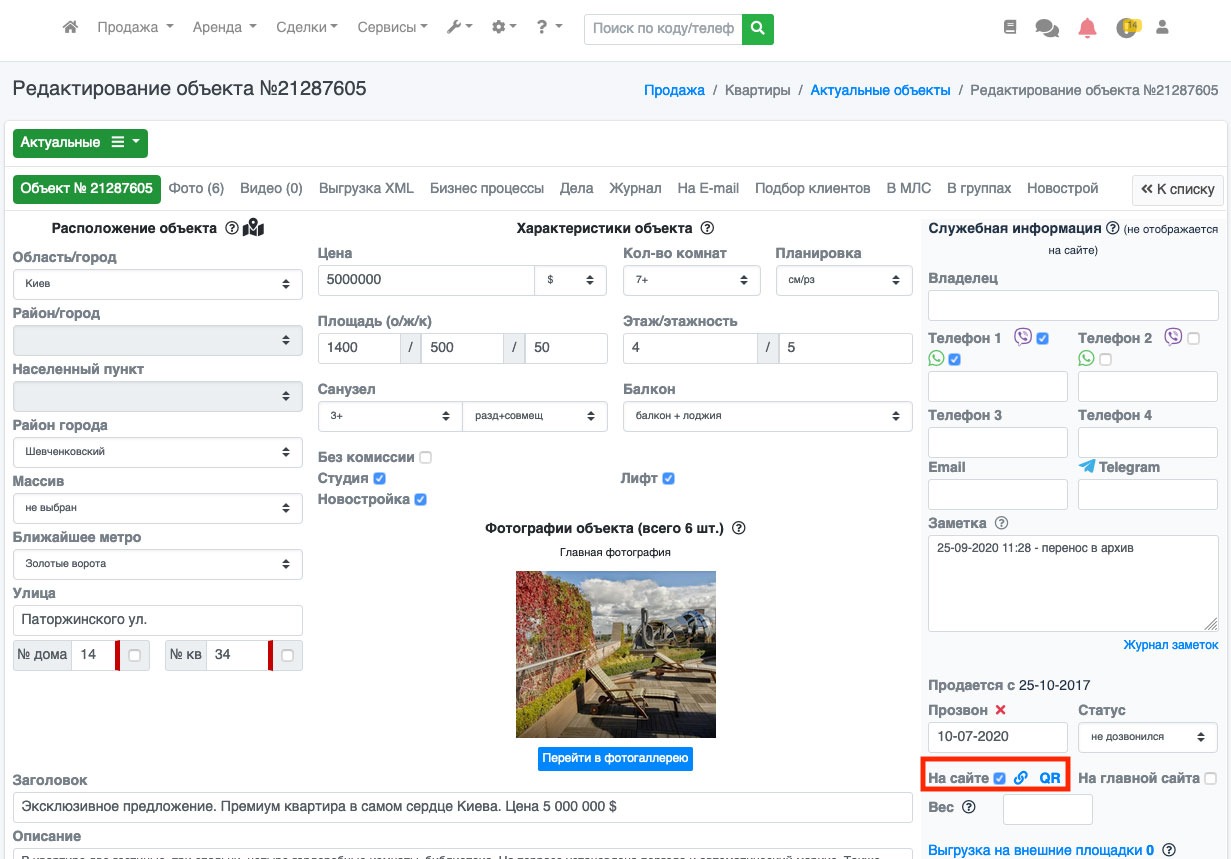- Менеджер aviso.ua пришлет на Вашу почту условия выгрузки на портал. После согласования всех условий и стоимости, автоматическая выгрузка запустится и будет полностью настроена. Все что Вам необходимо это просто вносить объекты в ЛигаПро и обязательно указывать галочку «на сайте» (Рис. 909). И в течении суток объект будет опубликован на портале aviso.ua.