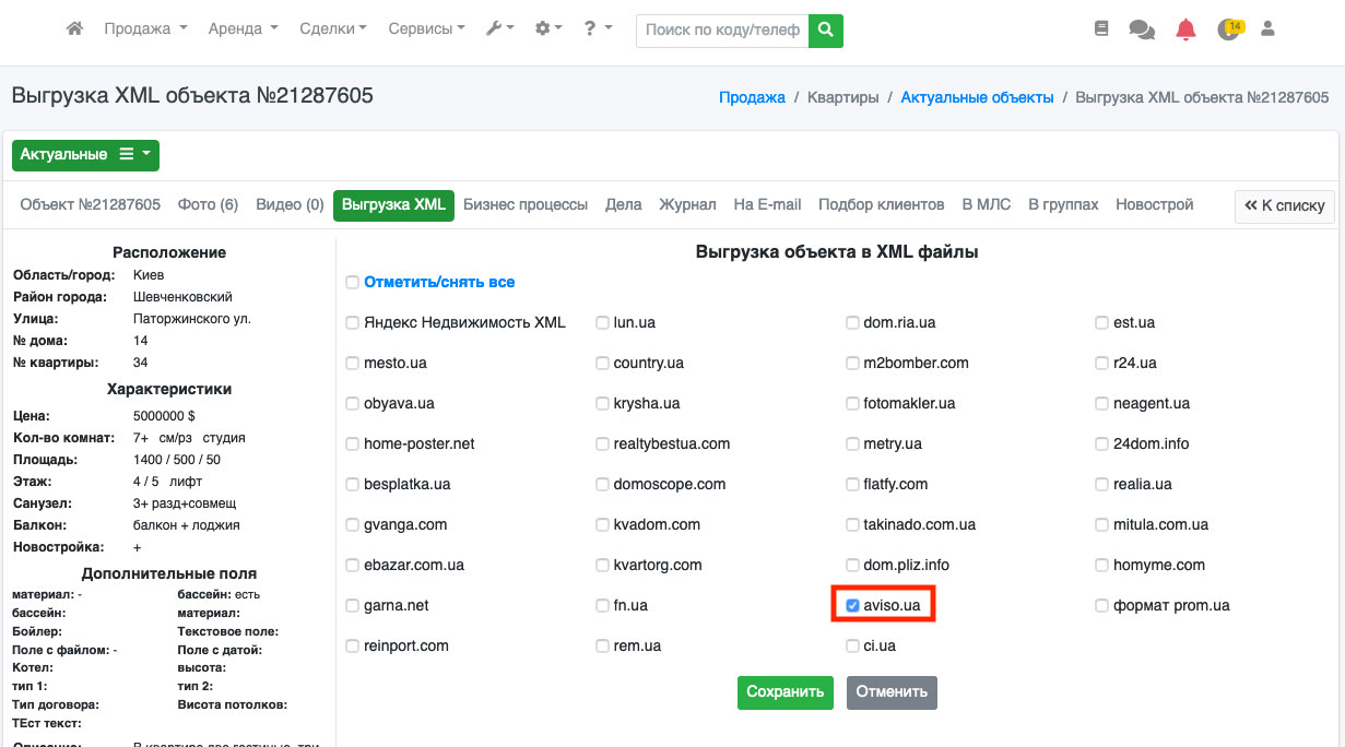 Если Вы отправили файл с выбранными объектами также необходимо в редактировании объекта на вкладке «Выгрузка XML» поставить галочку напротив портала aviso.ua и нажать кнопку сохранить, после этого объект попадает в файл с выбранными объектами и публикуется на aviso.ua (Рис. 910).