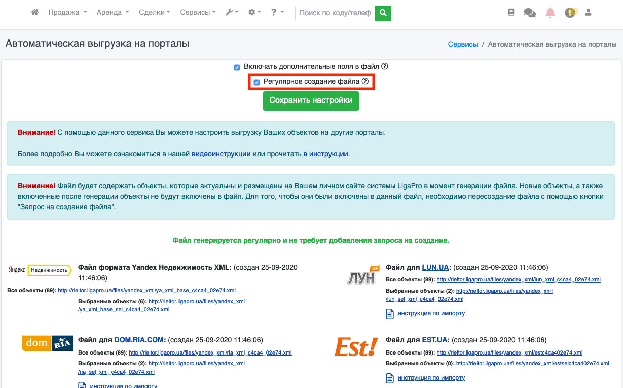 Чтобы найти ссылку на Ваш XML файл, в системе перейдите в пункт «Сервисы - Автоматическая выгрузка на порталы» (Рис. 924). Если на открывшейся странице еще нет списка файлов, поставьте галочку «Регулярное создание файла» и нажмите кнопку «Сохранить настройки». В течении дня файлы будут сгенерированы.