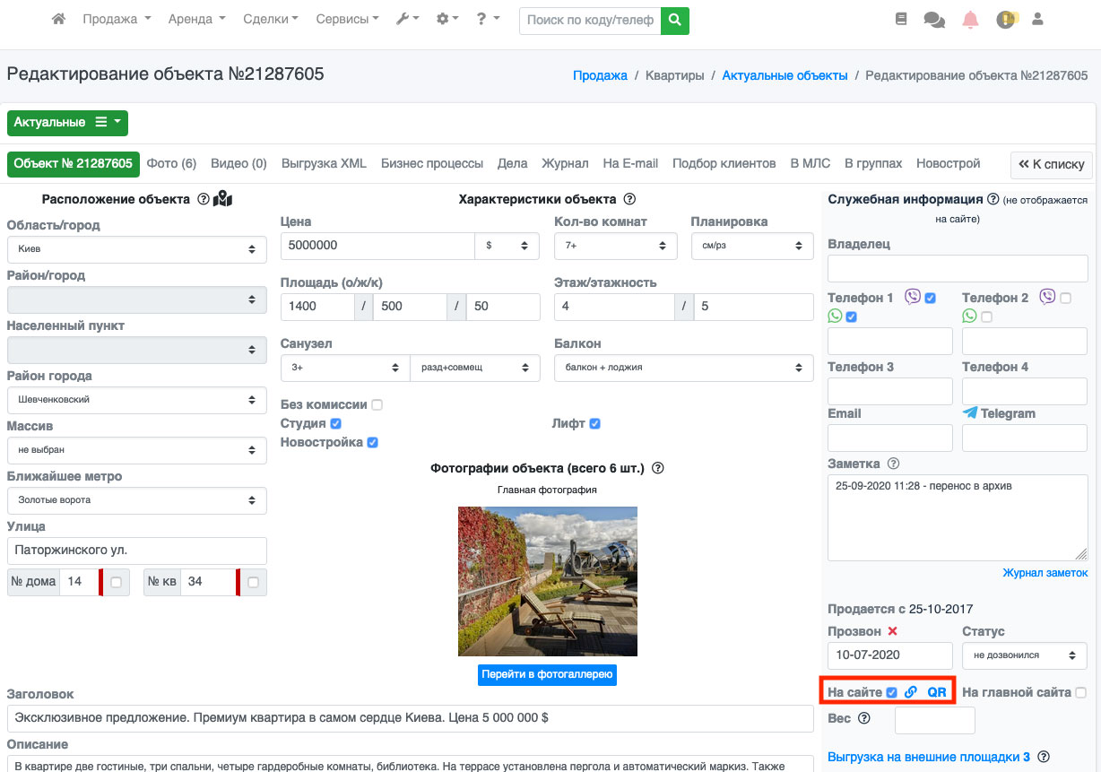 - Менеджер rem.ua пришлет на Вашу почту условия выгрузки на портал. После согласования всех условий и стоимости, автоматическая выгрузка запустится и будет полностью настроена. Все что Вам необходимо это просто вносить объекты в ЛигаПро и обязательно указывать галочку «на сайте» (Рис. 926). И в течении суток объект будет опубликован на портале rem.ua.