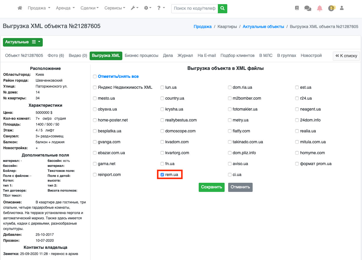 Если Вы отправили файл с выбранными объектами также необходимо в редактировании объекта на вкладке «Выгрузка XML» поставить галочку напротив портала rem.ua и нажать кнопку сохранить, после этого объект попадает в файл с выбранными объектами и публикуется на rem.ua (Рис. 927).