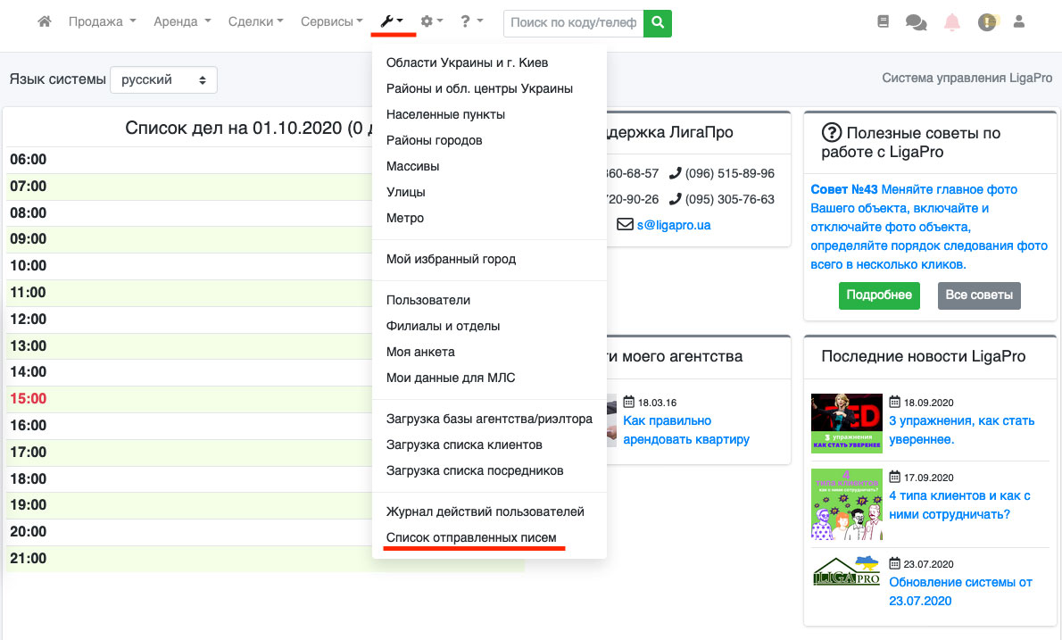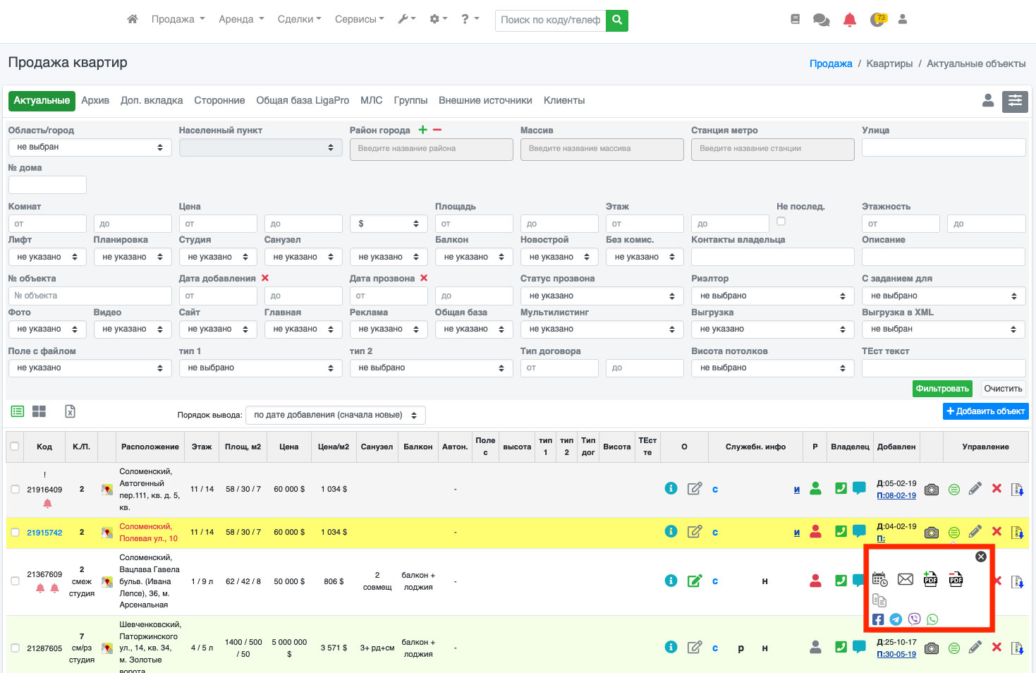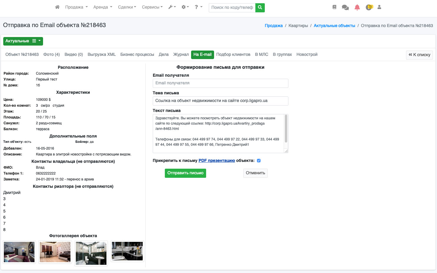 В системе ЛигаПро существует возможность автоматической отправки писем Вашим клиентам с информацией по объекту. Для этого в списке объектов напротив нужного объекта нажмите на зеленый круг с горизонтальными полосками, а в открывшемся меню выберите иконку конверта (Рис. 113).