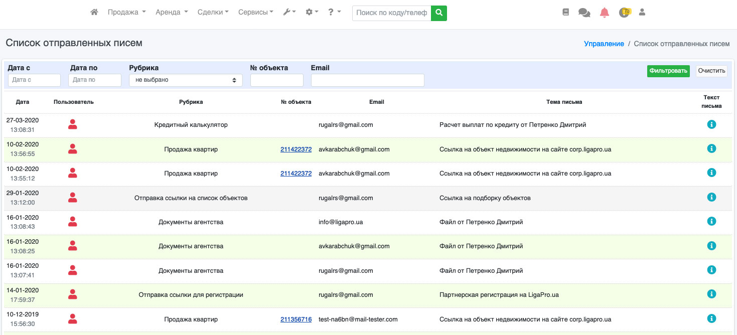 На открывшейся странице у Вас будет отображен список отправленых писем (Рис. 116). Для удобства работы предусмотрен фильтр по дате отправки, по рубрике, с которой был отправлен объект, по коду объекта, по e-mail получателя. Все эти параметры позволят максимально быстро найти интересующую Вас информацию.