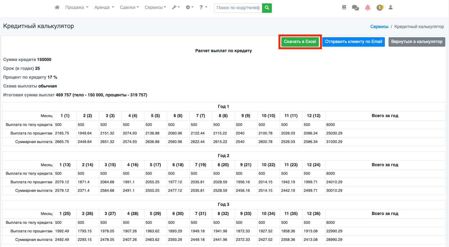 Этот калькулятор не только сможет рассчитать любой кредит на любой период. Он покажет всю сумму процентов, сумму переплаты, ежемесячные платежи и платежи за год, а также позволит все это выгрузить в Excel, после чего Вы легко сможете отправить или распечатать результаты и предоставить их Вашему клиенту (Рис. 129).