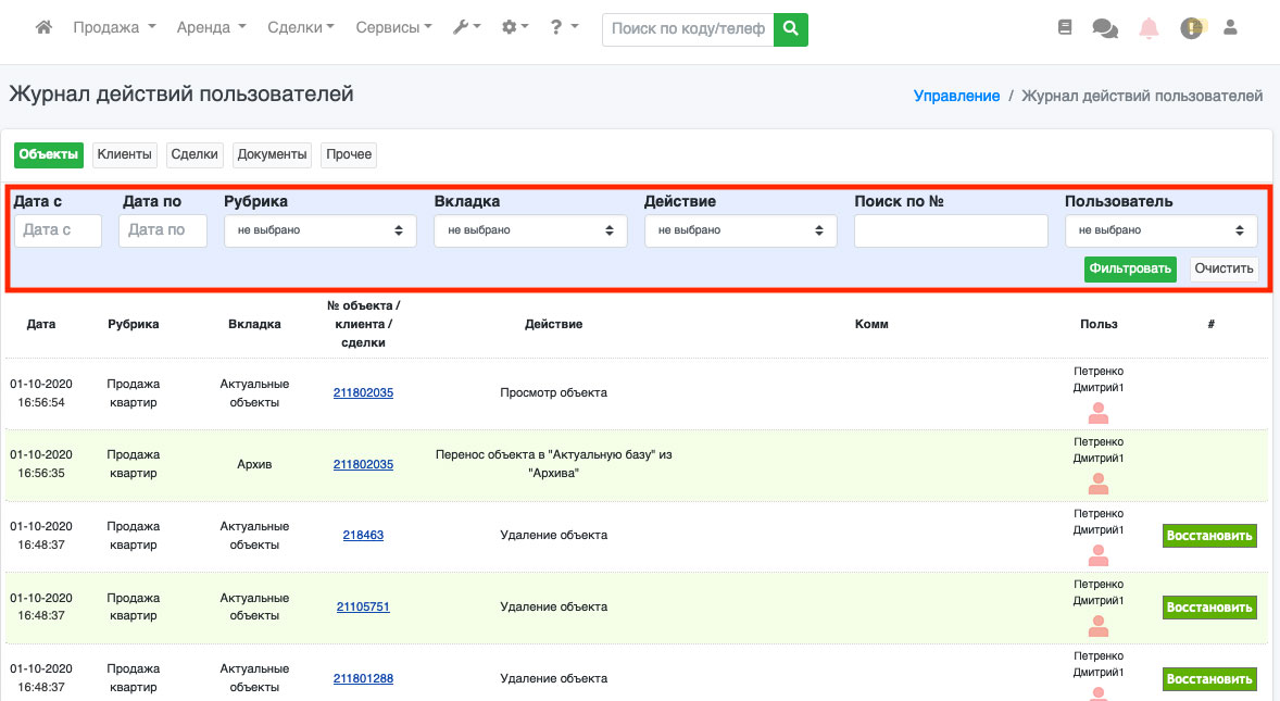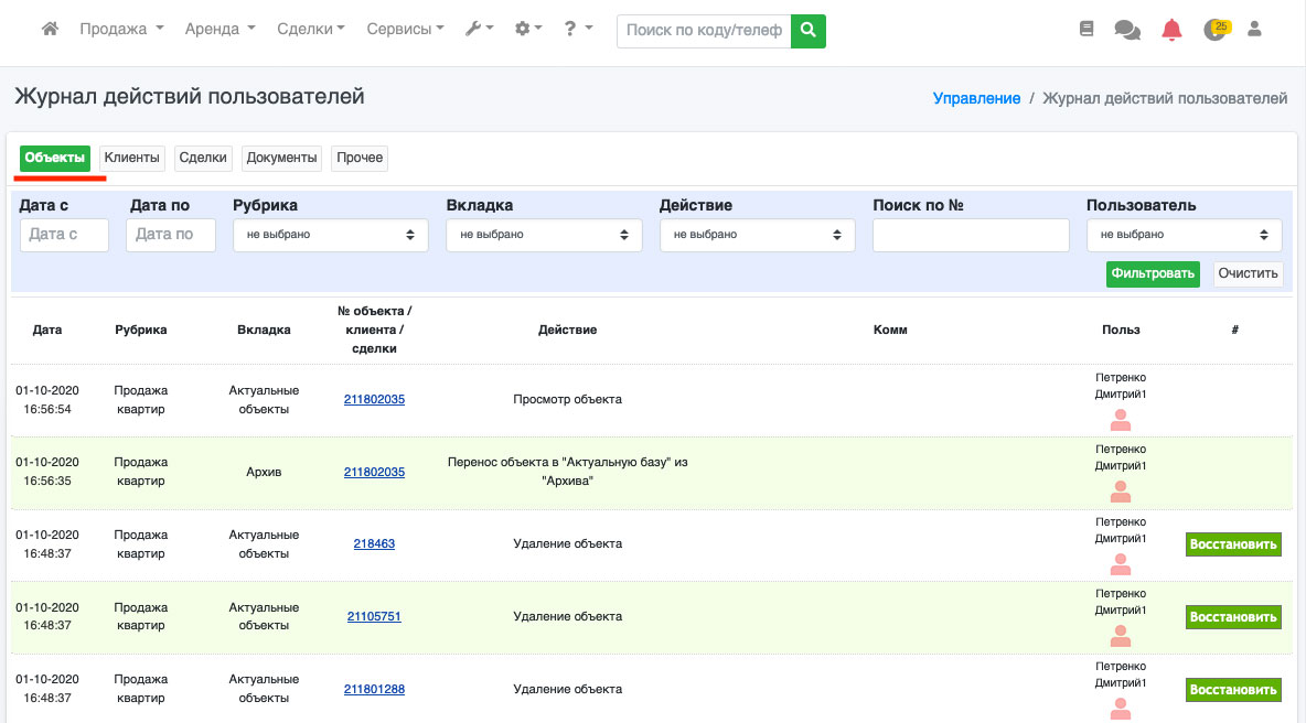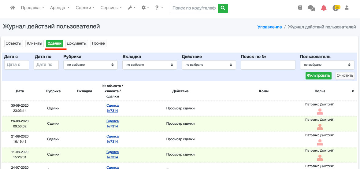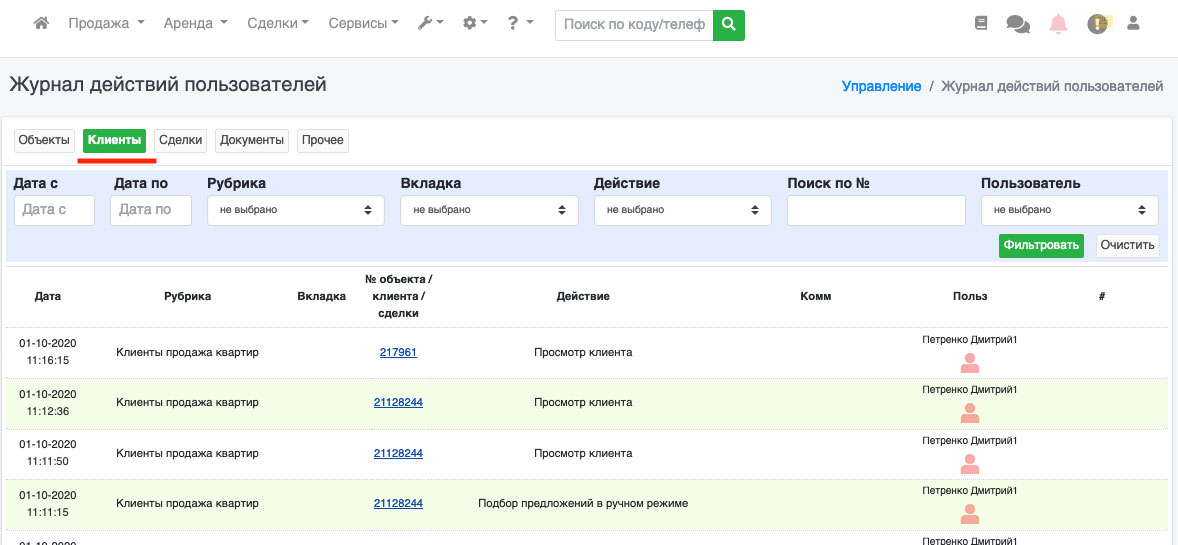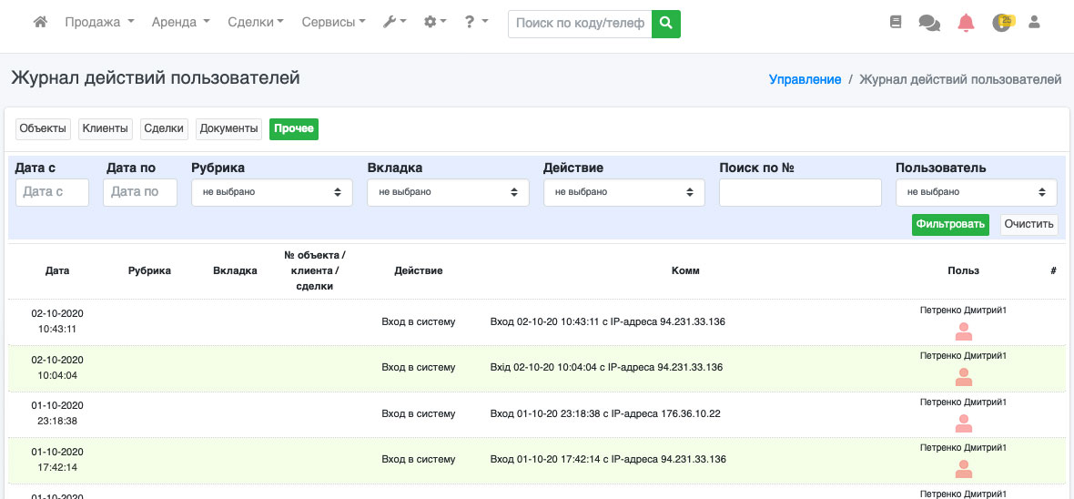 Журнал действий представляет собой список событий, которые произошли в системе. Все действия в системе записываются и фиксируются. Журнал действий доступен только главному администратору системы и пользователям которым главный администратор предоставил доступ к журналу. Для удобства мониторинга журнал действий разделен на 4 вкладки: объекты, клиенты, сделки, документы, прочее.
