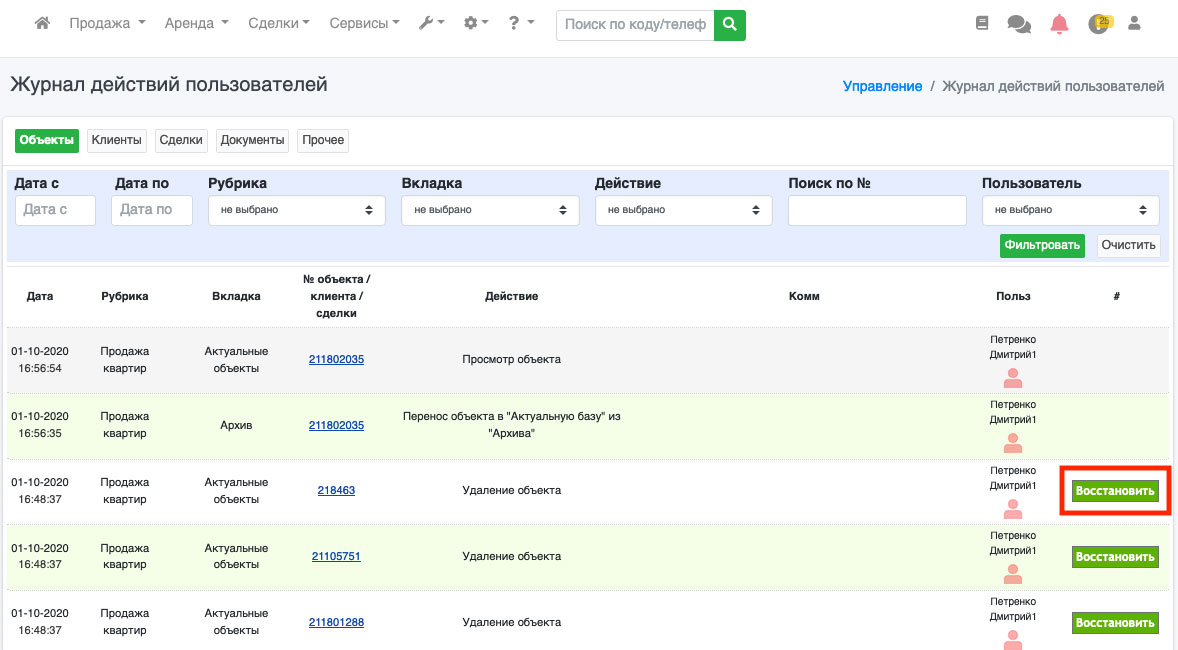 Во вкладке объекты Вы можете отследить такие действия (Рис. 154):