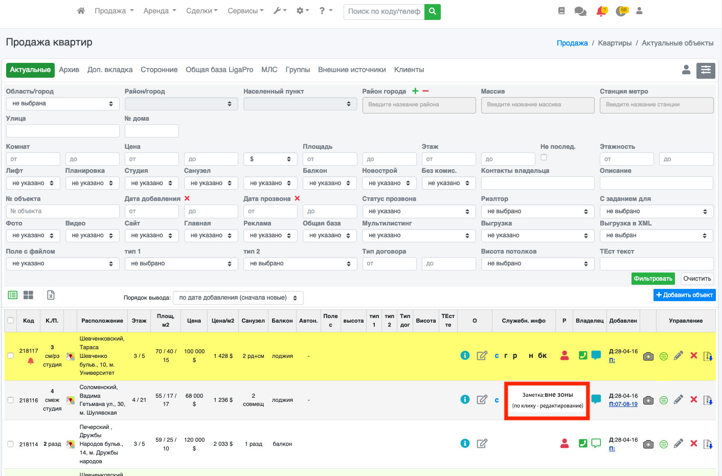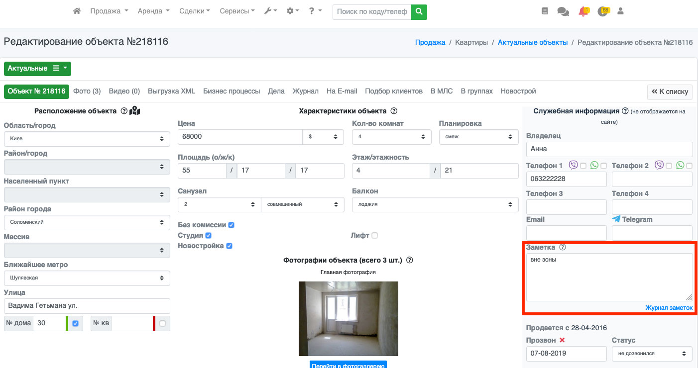 Все заметки к этому объекту сохраняются с возможностью их просмотра. Пример. Квартира актуальна и пользователь оставил заметку: «Актуально». Через несколько дней объект стал не актуален и уже другой пользователь оставил заметку: «Не актуально». Теперь если Вы на странице редактирования объекта нажмете на ссылку «Журнал заметок», Вам отобразится две записи. «Не актуально» Пользователь 1 Дата и время и «Актуально» Пользователь 2 Дата и время. Теперь вся история объекта будет видна в Ваших заметках (Рис 163).