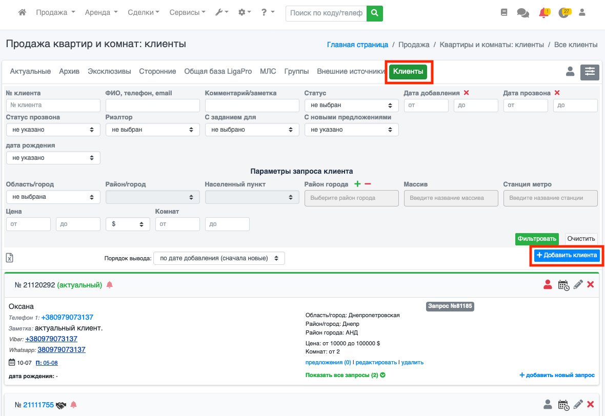В системе ЛигаПро существует возможность ведения базы клиентов по спросу (клиентов на покупку или аренду объектов недвижимости). Для того, чтобы добавить клиента, необходимо выбрать необходимый раздел (продажа или аренда), после чего выбрать нужную рубрику и на открывшейся странице найти вкладку «Клиенты». На открывшейся вкладке справа вверху нажать на синюю кнопку «Добавить клиента» (Рис. 242).