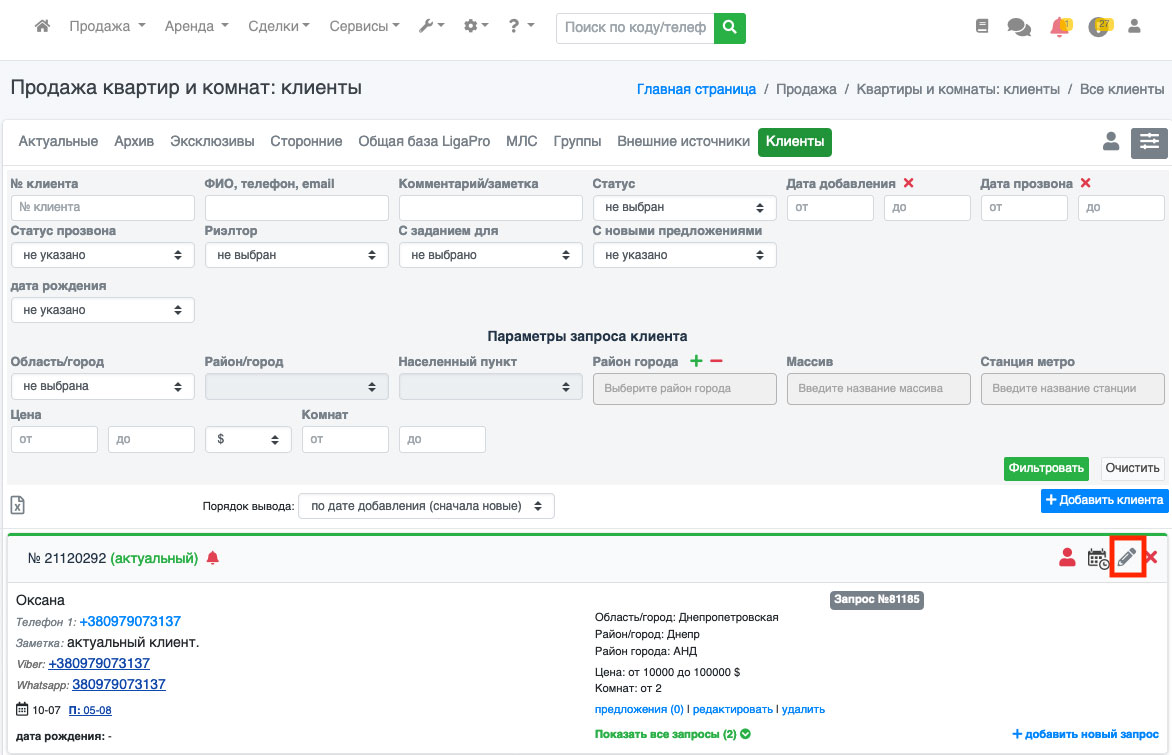 Все клиенты в системе выводятся в виде списка. Для редактирования клиента нужно нажать на иконку «Карандаш» напротив нужного клиента (Рис. 244).