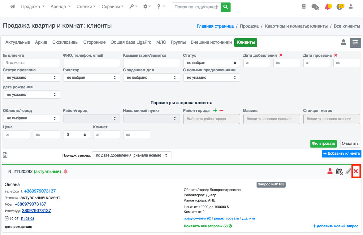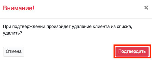 Чтобы удалить клиента, нужно нажать на иконку «Крестик» напротив нужного клиента (Рис. 246).