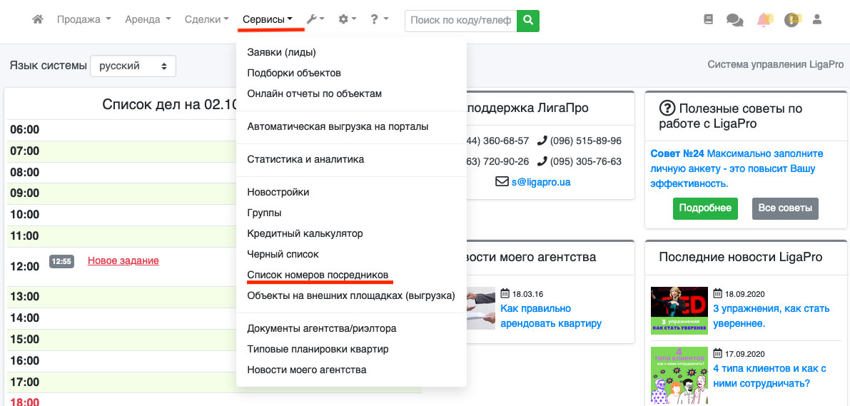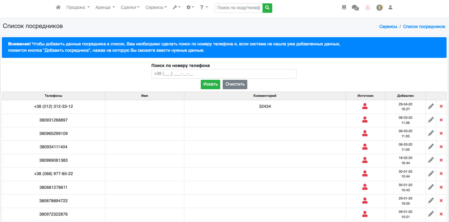 В системе ЛигаПро существует возможность формировать и вести свою базу риэлторов других агентств. Чтобы воспользоваться этой функцией - зайдите в пункт меню «Сервисы - Список номеров посредников» (Рис. 274).