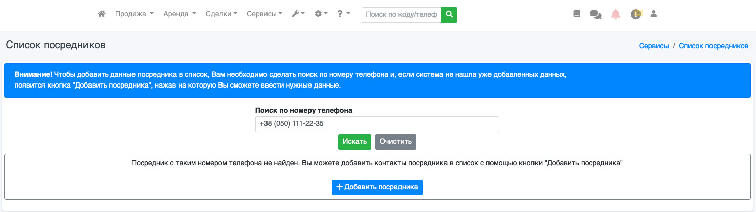 Чтобы проверить номер, введите номер телефона в форму поиска и нажмите кнопку «Искать». Если телефон есть в базе, Вам отобразится информация о риэлторе, если такого номера нет в базе - система предложит добавить номер в базу (Рис. 276).