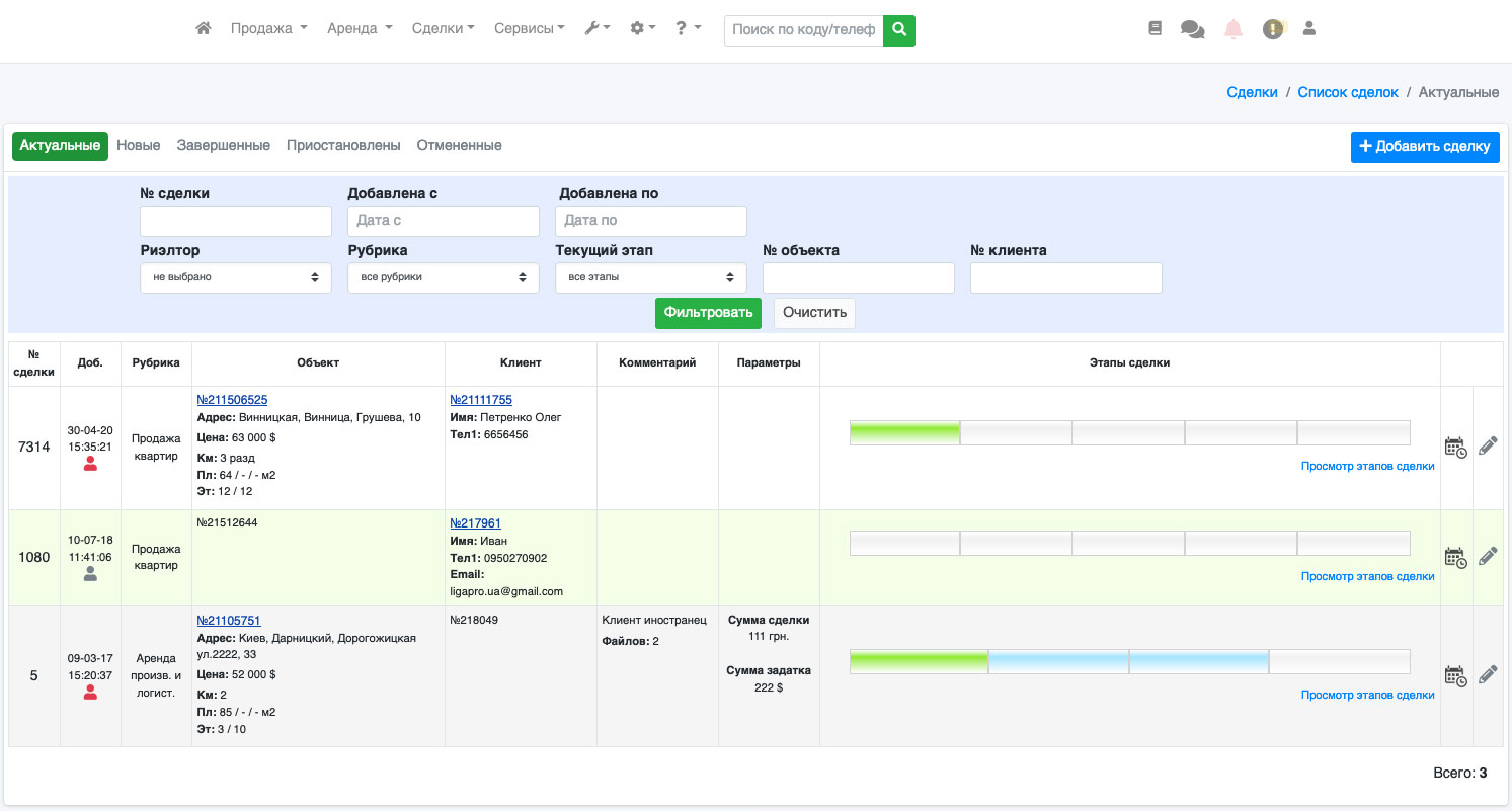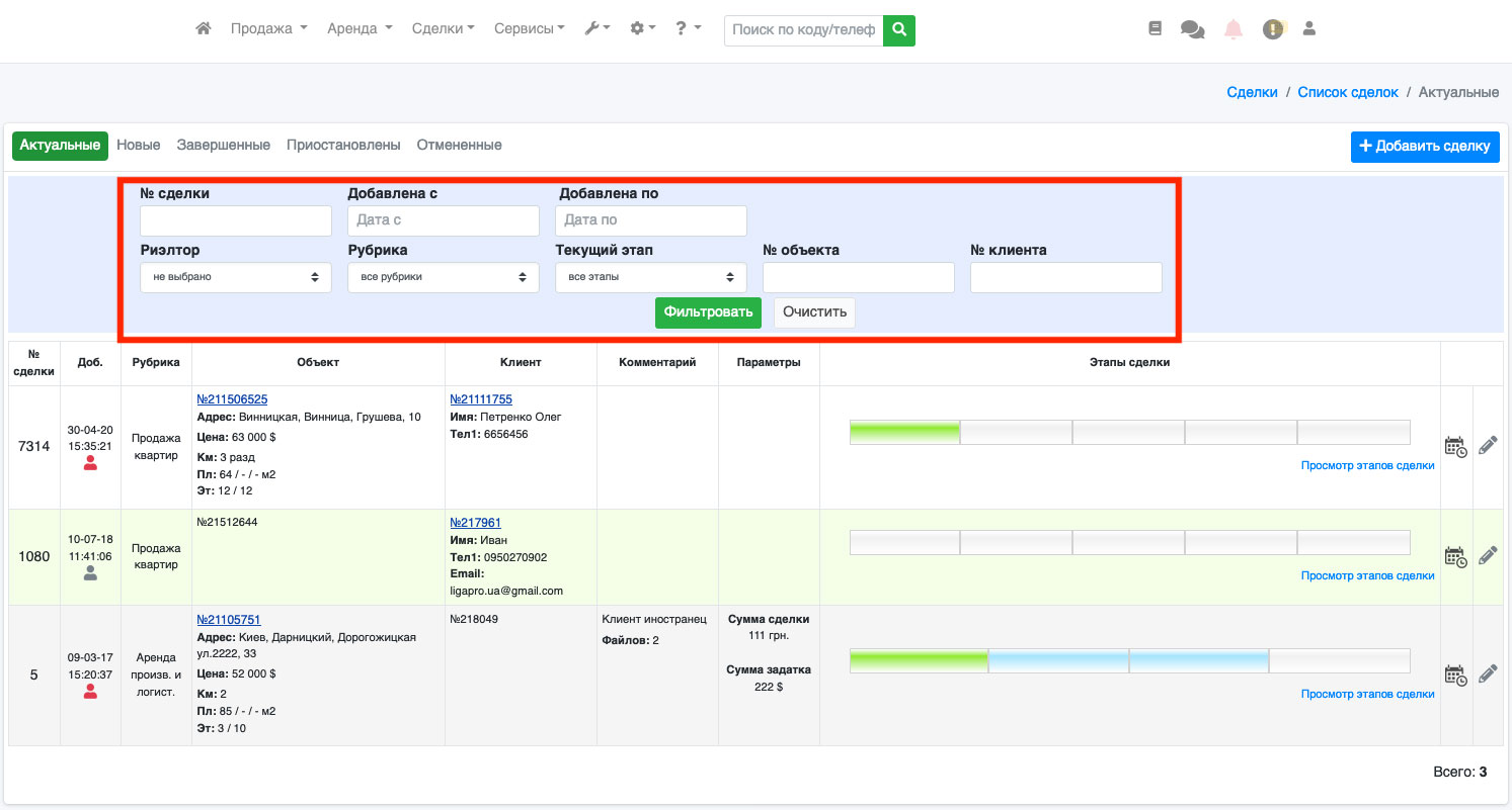 Обращаем Ваше внимание, что вне зависимости от рубрики (продажа/аренда) и типа недвижимости, все сделки находятся в одном списке, но Вы всегда можете отфильтровать сделки по номеру, рубрике, текущему этапу, пользователю, по номеру объекта или клиента, или дате добавления (Рис. 279).