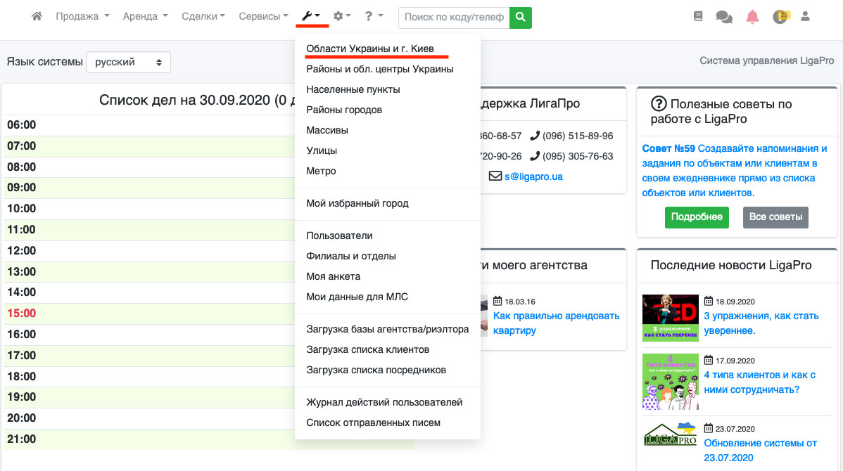 В этом пункте меню Вы можете управлять районами областей и областными центрами. Изначально за каждой областью закреплены ее районы и областной центр. В этом меню Вы сможете: