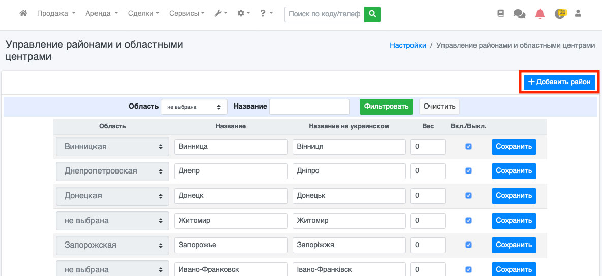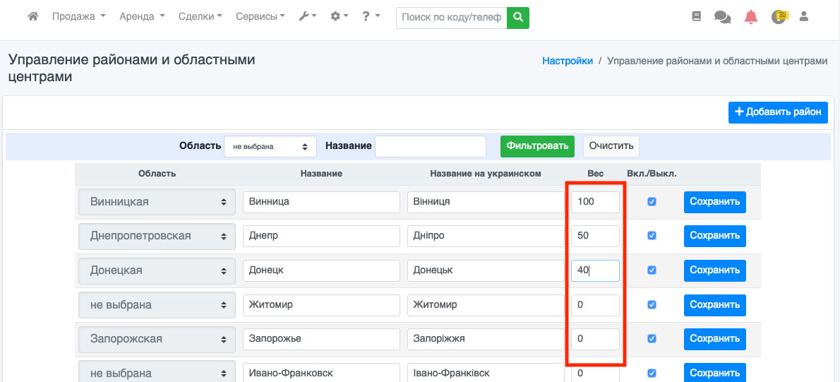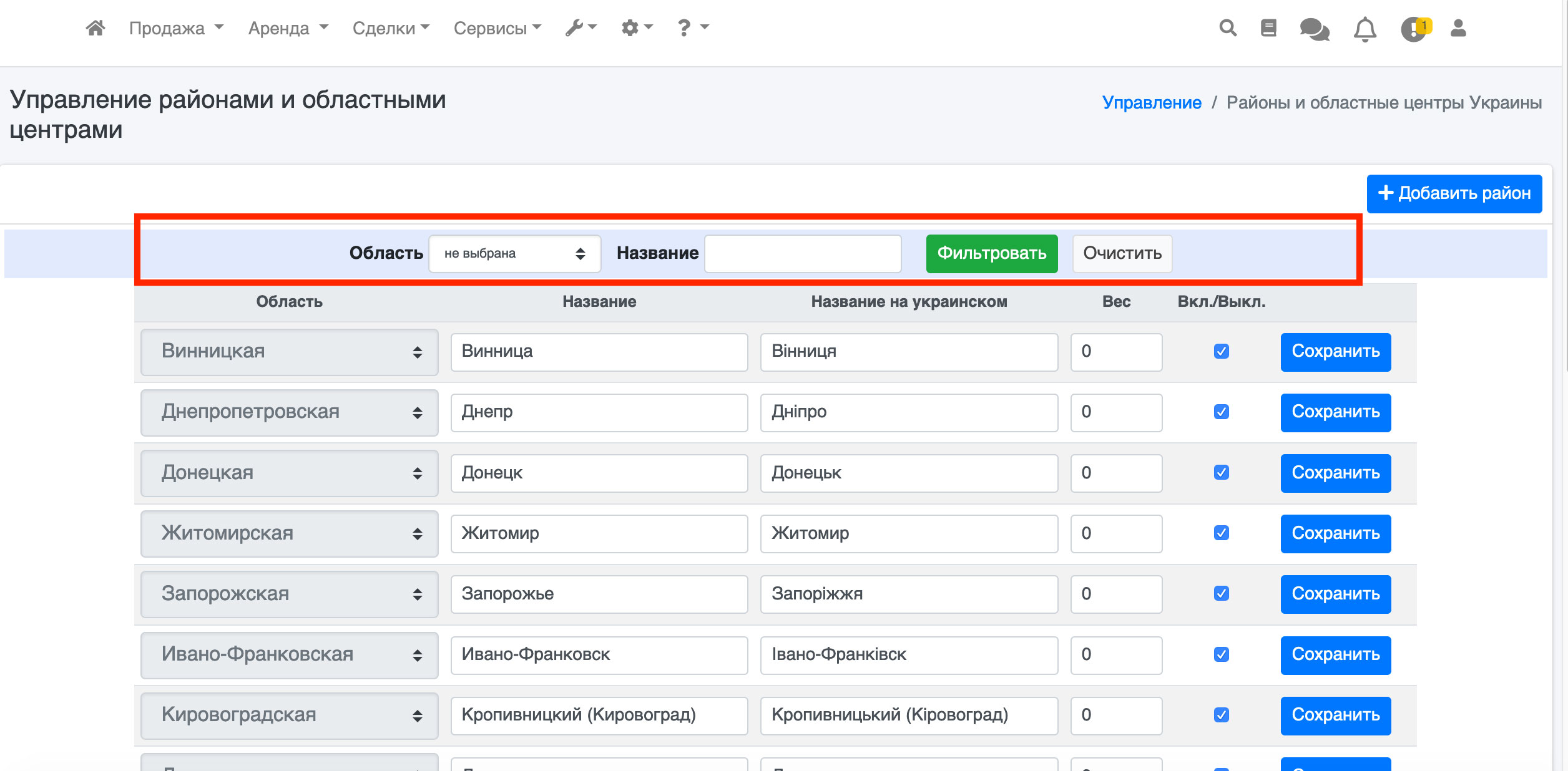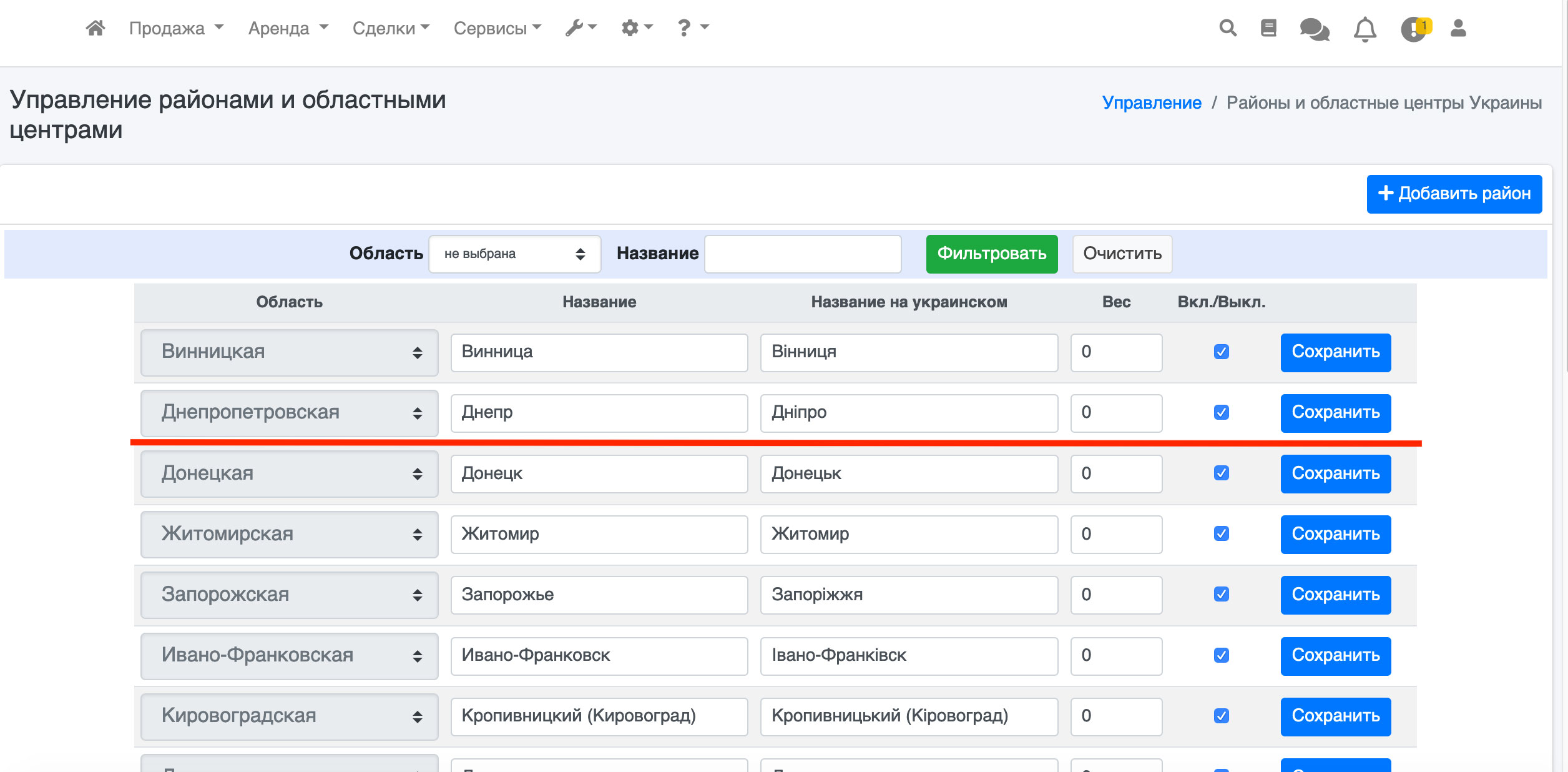 Для редактирования района или областного центра, Вы просто находите его в списке и выполняете необходимые действия (смена названия, смена веса района, статус «вкл/выкл) и нажимаете кнопку «Сохранить» напротив этого района (рис. 21)
