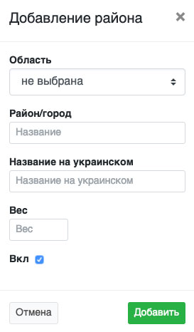 У Вас откроется диалоговое окно, в котором необходимо выбрать область, в которую Вы хотите добавить новый район, указать его название (дополнительно можно указать название на украинском языке), установите «вес», поставке галочку «вкл» и нажмите кнопку «Добавить» (Рис. 20). После этих действий район будет добавлен в систему.