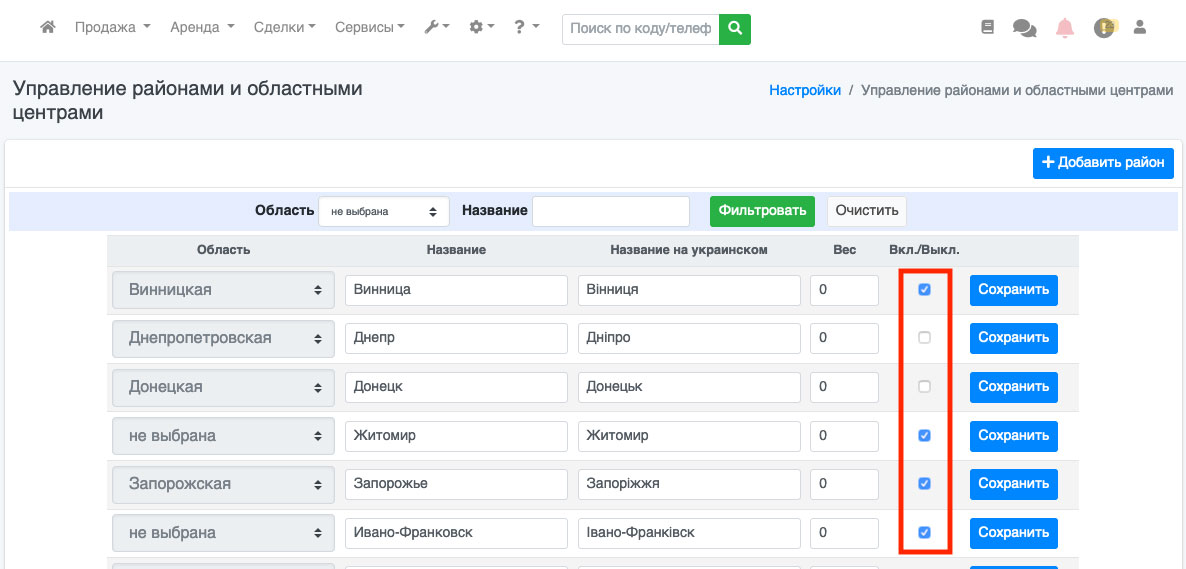 Для отключения района/областного центра, Вы просто находите его в списке, и в поле «ВКЛ» убираете галочку и нажмите кнопку «Сохранить», после чего район будет отключен (рис. 23).