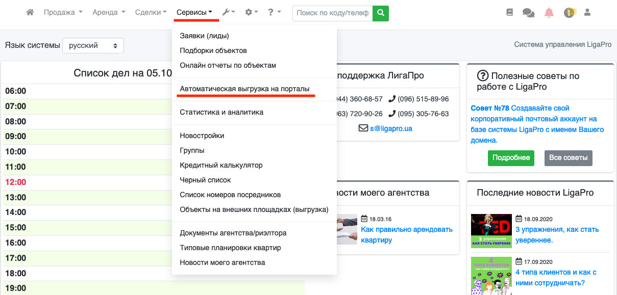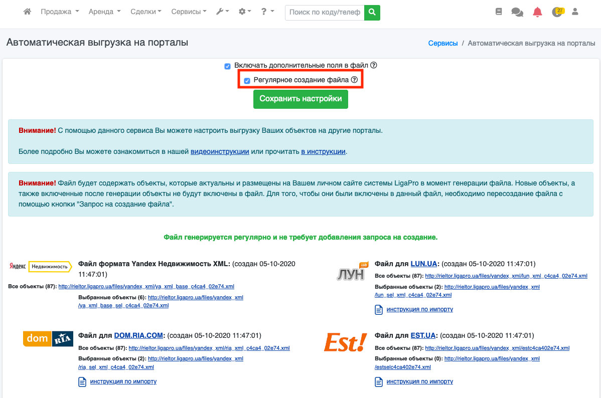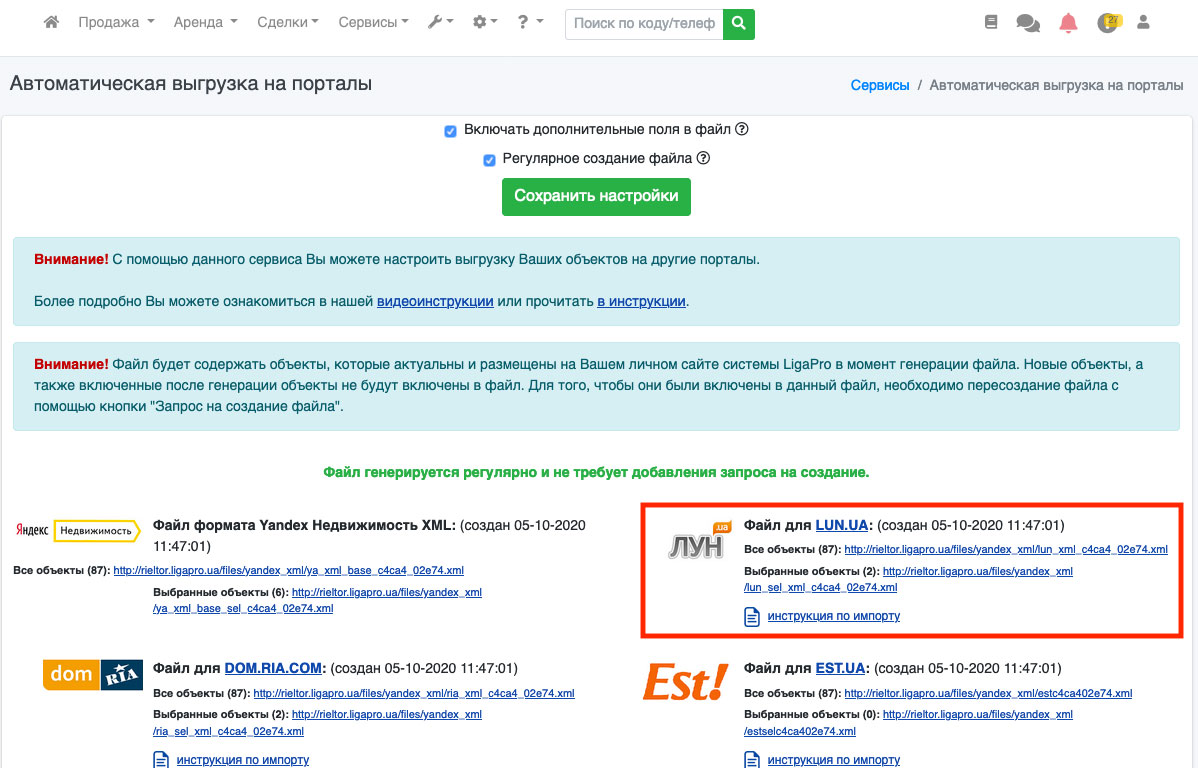 В системе ЛигаПро существует возможность автоматической выгрузки объектов на портал Lun.ua.