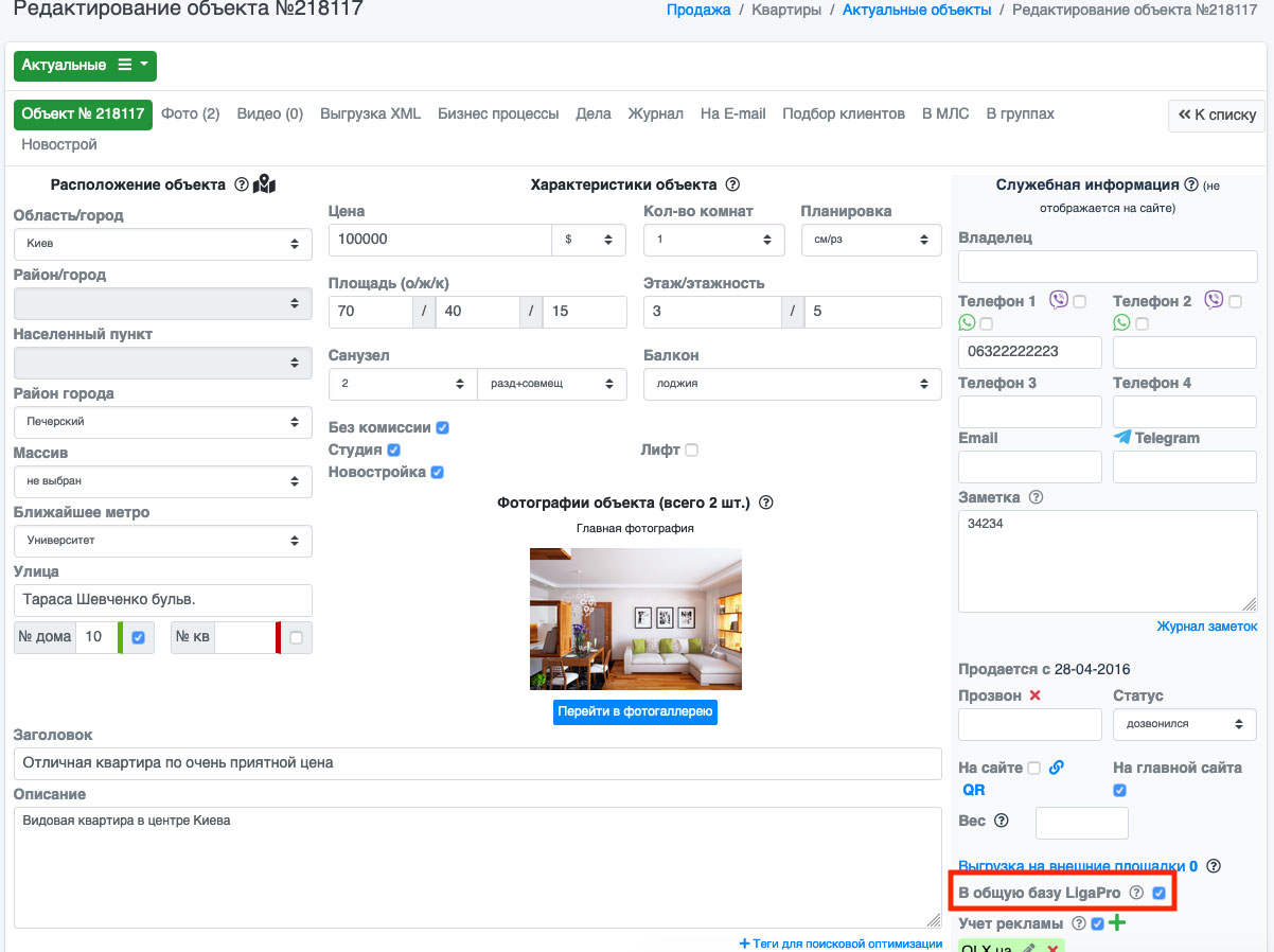 Для обмена объектами между разными пользователями системы ЛигаПро была создана общая база, где каждый пользователь системы может опубликовать свое объявления. Чтобы добавить объект в общую базу, зайдите в редактирование объекта (Рис. 338).