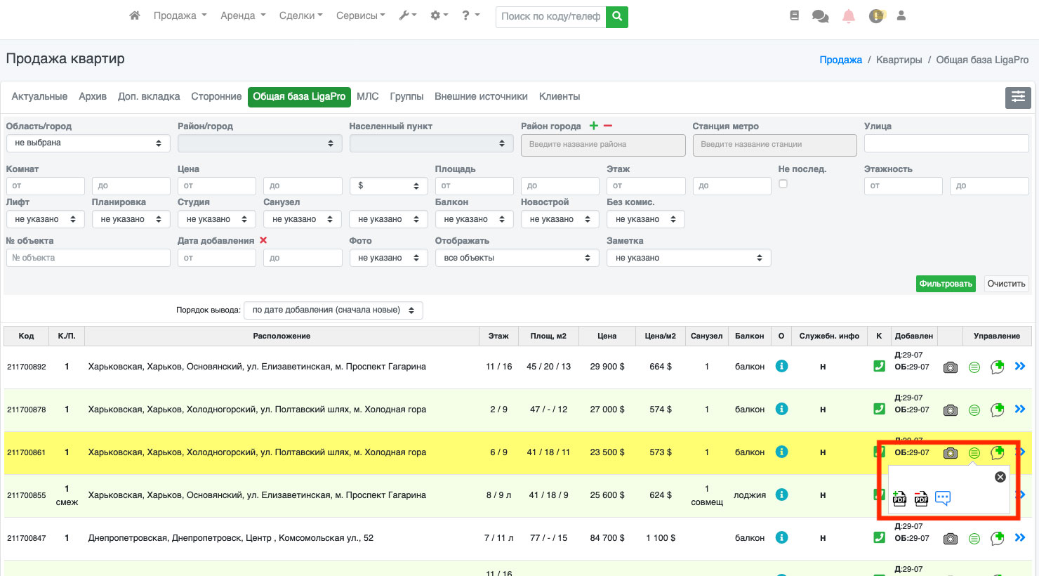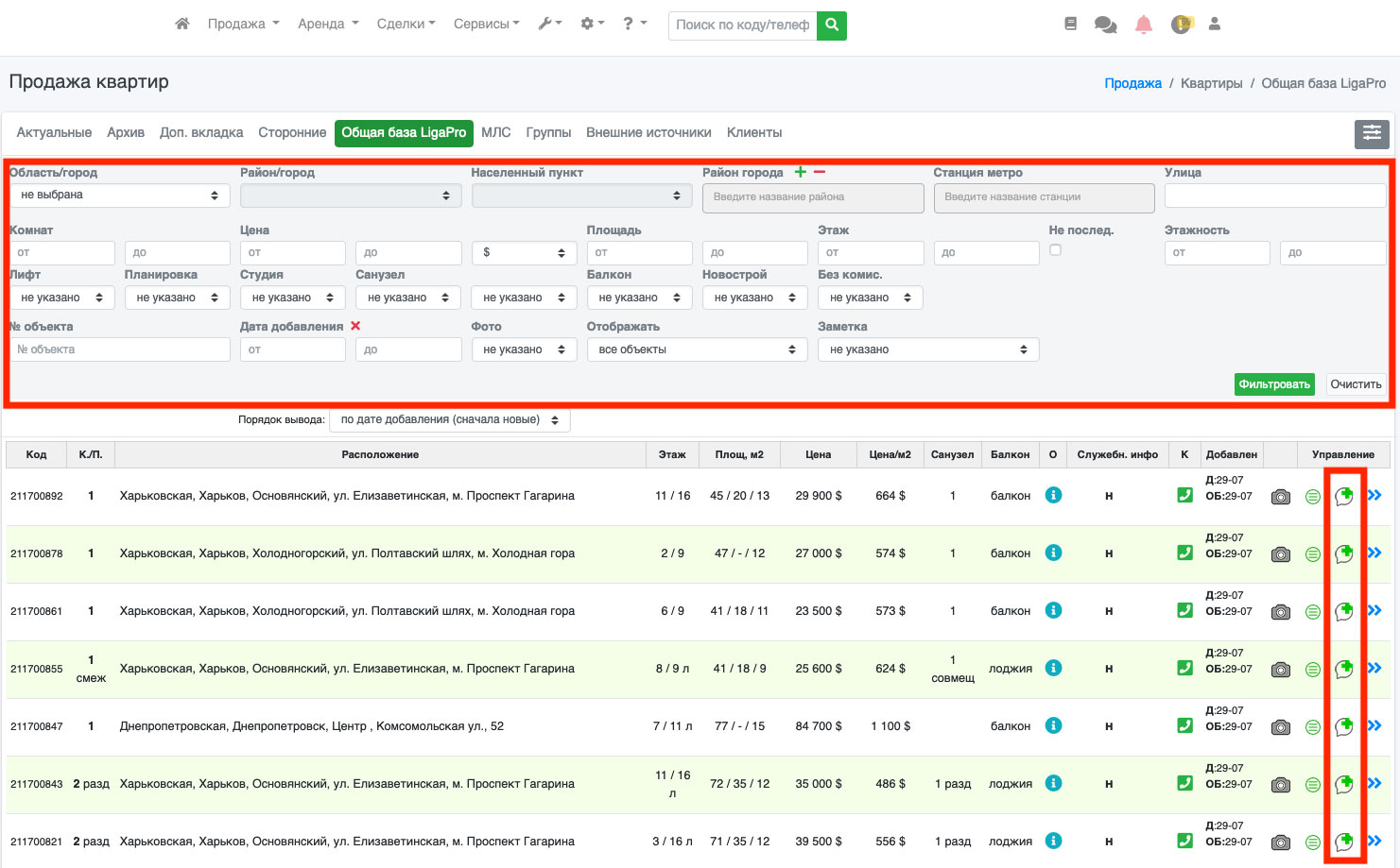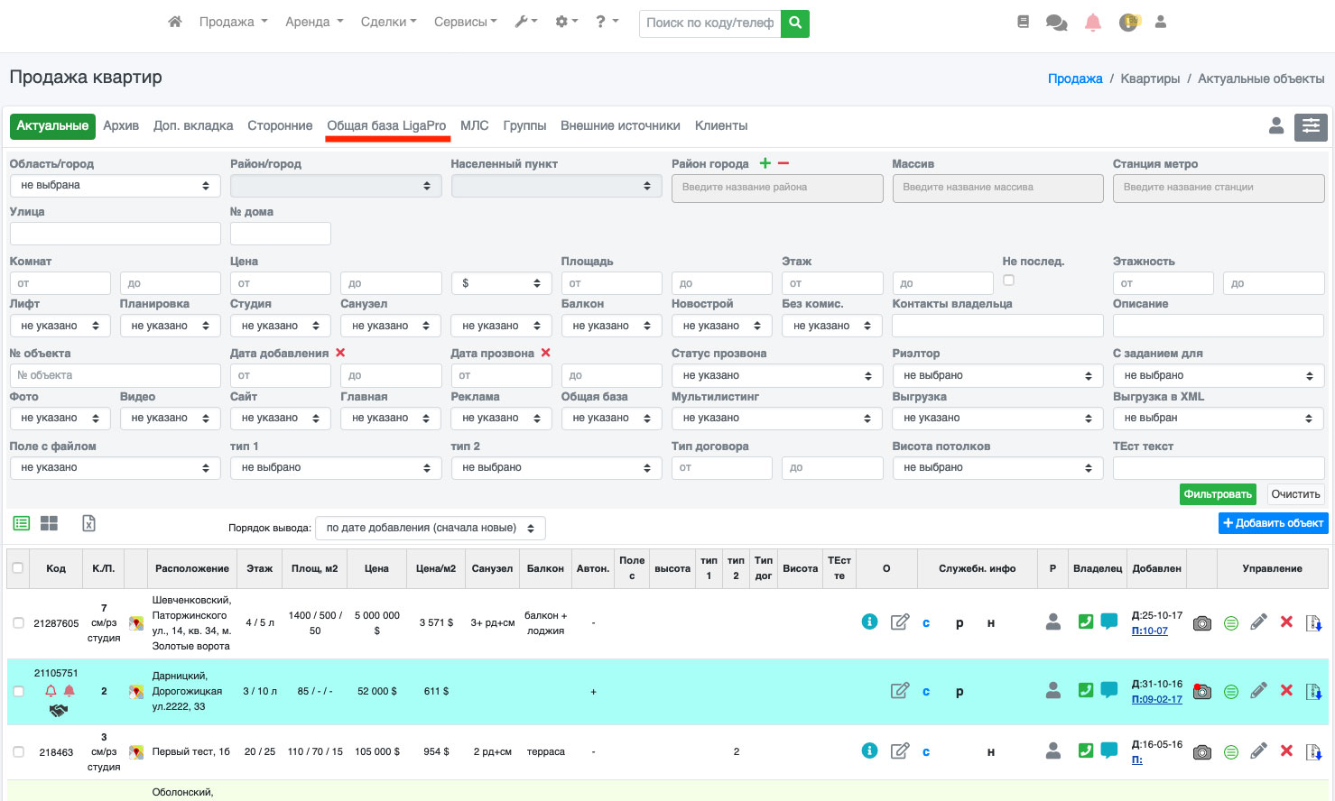 Чтобы посмотреть объекты Ваших коллег в общей базе - зайдите в интересующую Вас рубрику, перейдите на вкладку “Общая база LigaPro” (Рис. 340) и на странице отобразится список объектов общей базы.