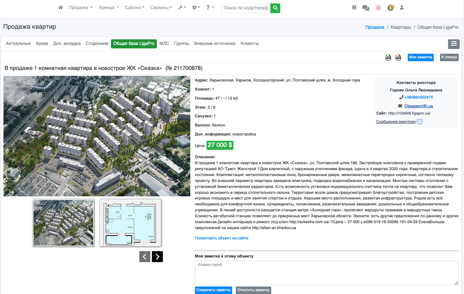Для подробного просмотра объекта необходимо нажать на иконку “синии стрелки” справа напротив нужного объекта. На открывшейся странице (Рис. 343) Вы сможете подробнее ознакомиться с объектом, посмотреть фото, добавить заметку, посмотреть контактную информацию по объекту.