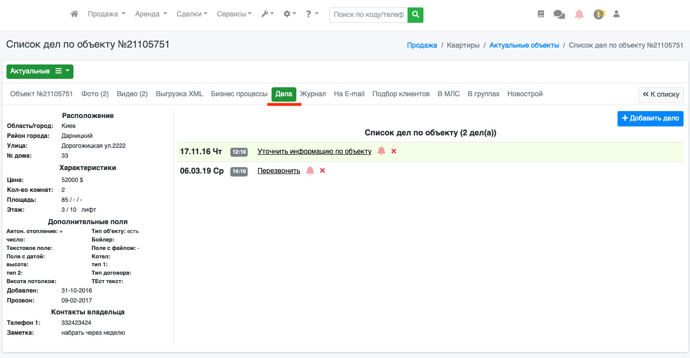 Чтобы посмотреть всю историю дел и событий, которые Вы или Ваши коллеги планировали по объекту, просто зайдите в редактирование объекта в любой рубрике (Рис. 390).