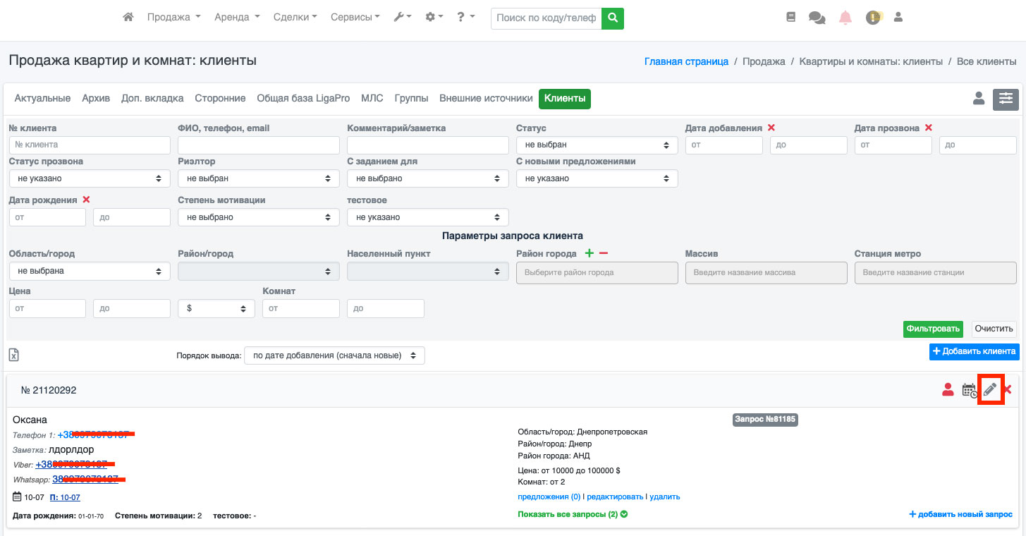 В системе LigaPro в контактной информации в клиентах по спросу можно добавлять и хранить Viber и WhatsApp номера клиентов. Чтобы добавить Viber и WhatsApp номера перейдите в редактирование клиента (Рис. 513).