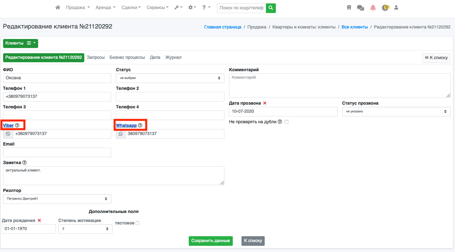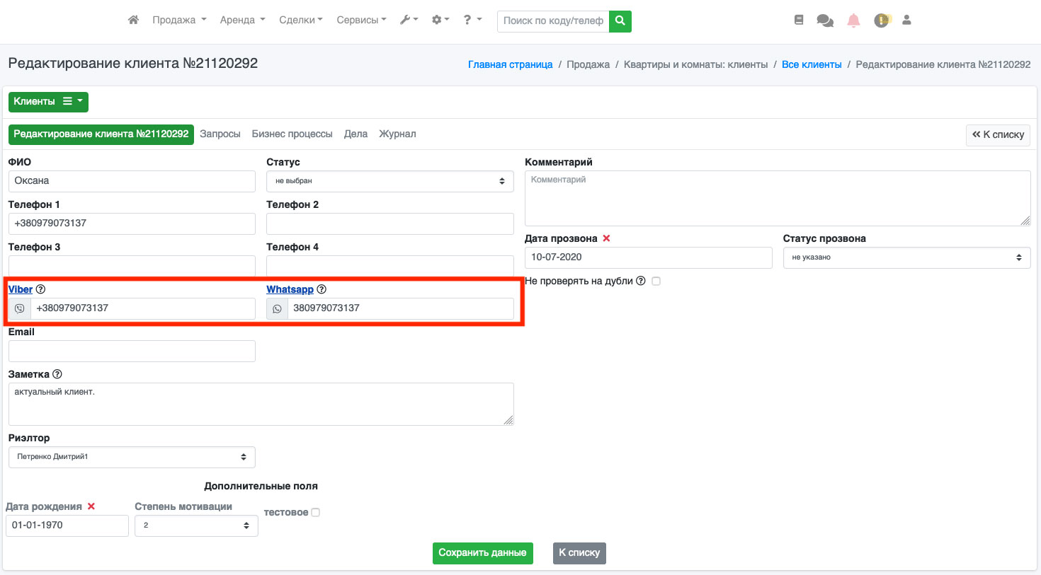 На открывшейся странице редактирования клиента найдите поля для ввода Viber и WhatsApp номера (Рис. 514). Обращаем Ваше внимание, что номер Viber и WhatsApp нужно вводить в определенном формате, чтобы система могла корректно распознавать номера клиентов. Формат телефона Viber: +38067ххххххх. Формат телефона WhatsApp: 38067ххххххх.