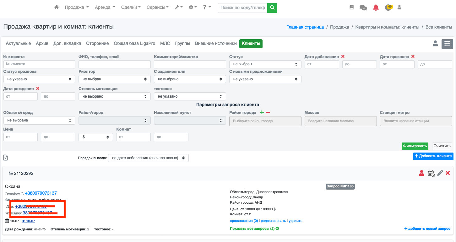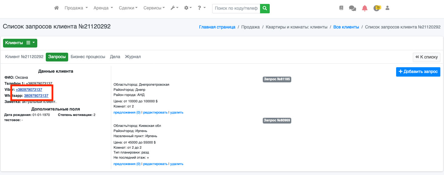 После того как Вы правильно добавили номера телефонов Viber и WhatsApp в списке клиентов у Вас появились активные ссылки на Viber и WhatsApp номер (Рис. 515).