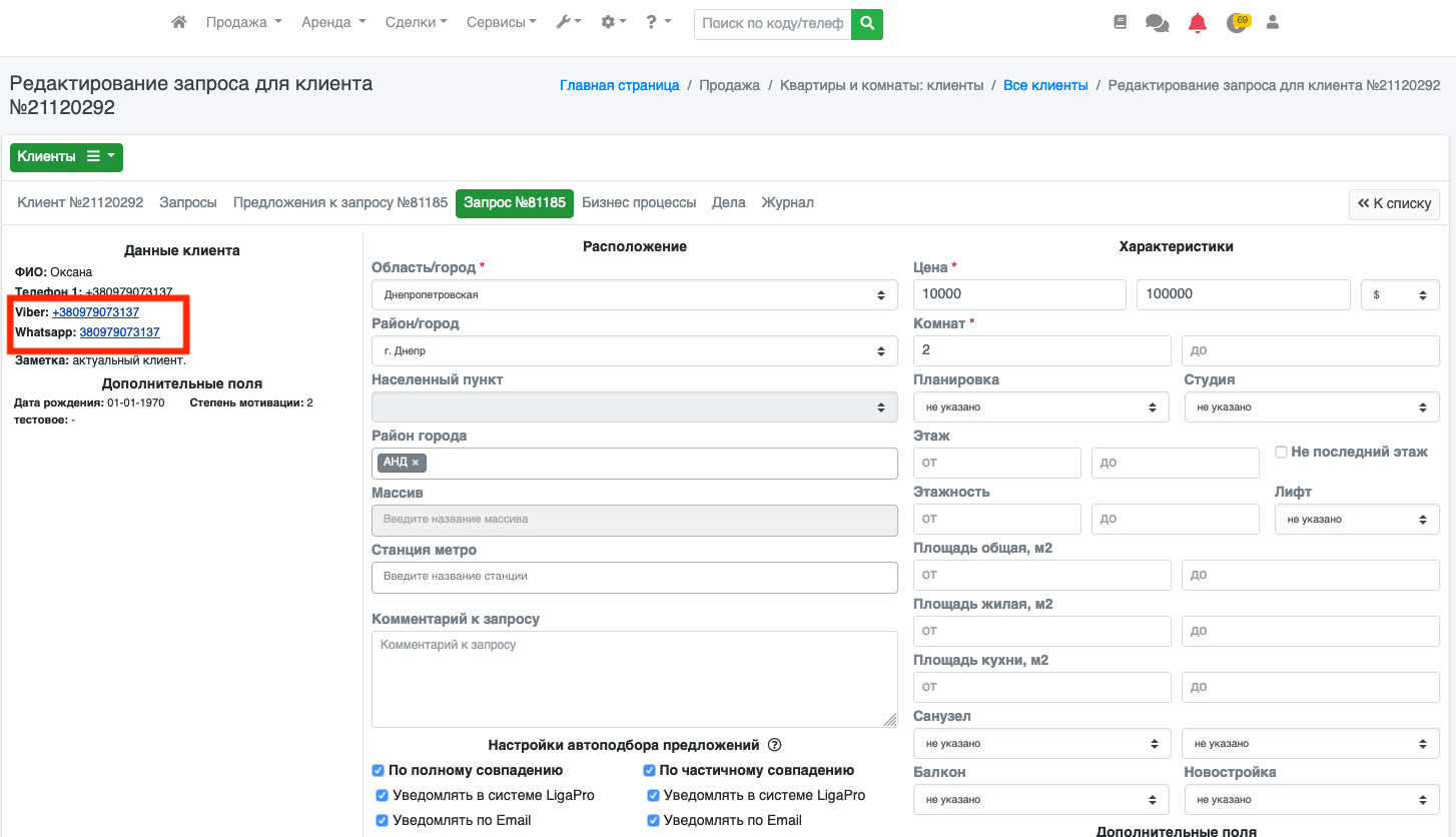 Теперь в любой момент Вы можете просто нажать на номер Viber или WhatsApp и у Вас откроется чат с клиентом (Рис. 516-517). Обращаем Ваше внимание, чтобы данная функция работала, у Вас должно быть установлено приложение Viber или WhatsApp на то устройство, на котором Вы работаете (компьютер, смартфон).